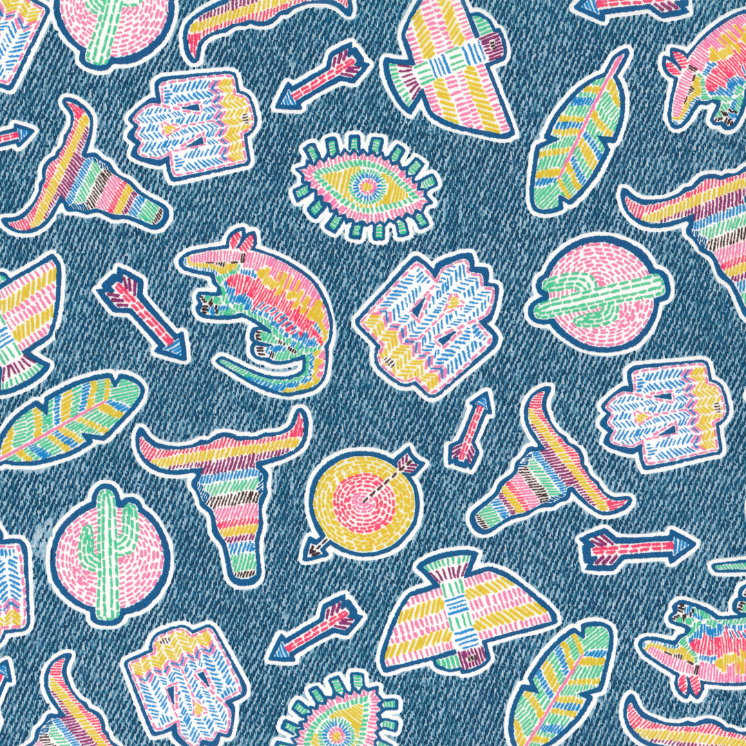 "Inspired by embroidered patches, Sheriff Brian is a fun conversational design created using coloured pencils and reworked denim fabric to create a textured ground."