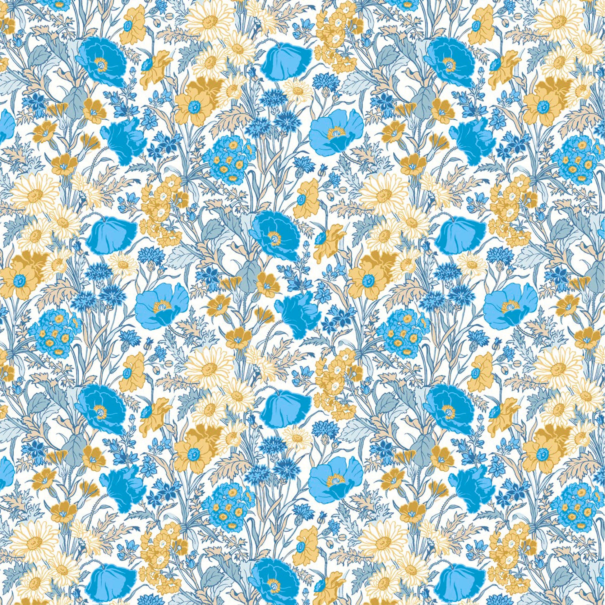 Based on a hand-painted artwork discovered in the Liberty archive, Florence May features a plethora of wild flowers typically growing in the English countryside. Elegant poppies, daisies, daffodils, primroses, pinks, corn flowers and forget-me-nots follow a subtle trailing pattern, conjuring up images of long walks through dazzling spring meadows.