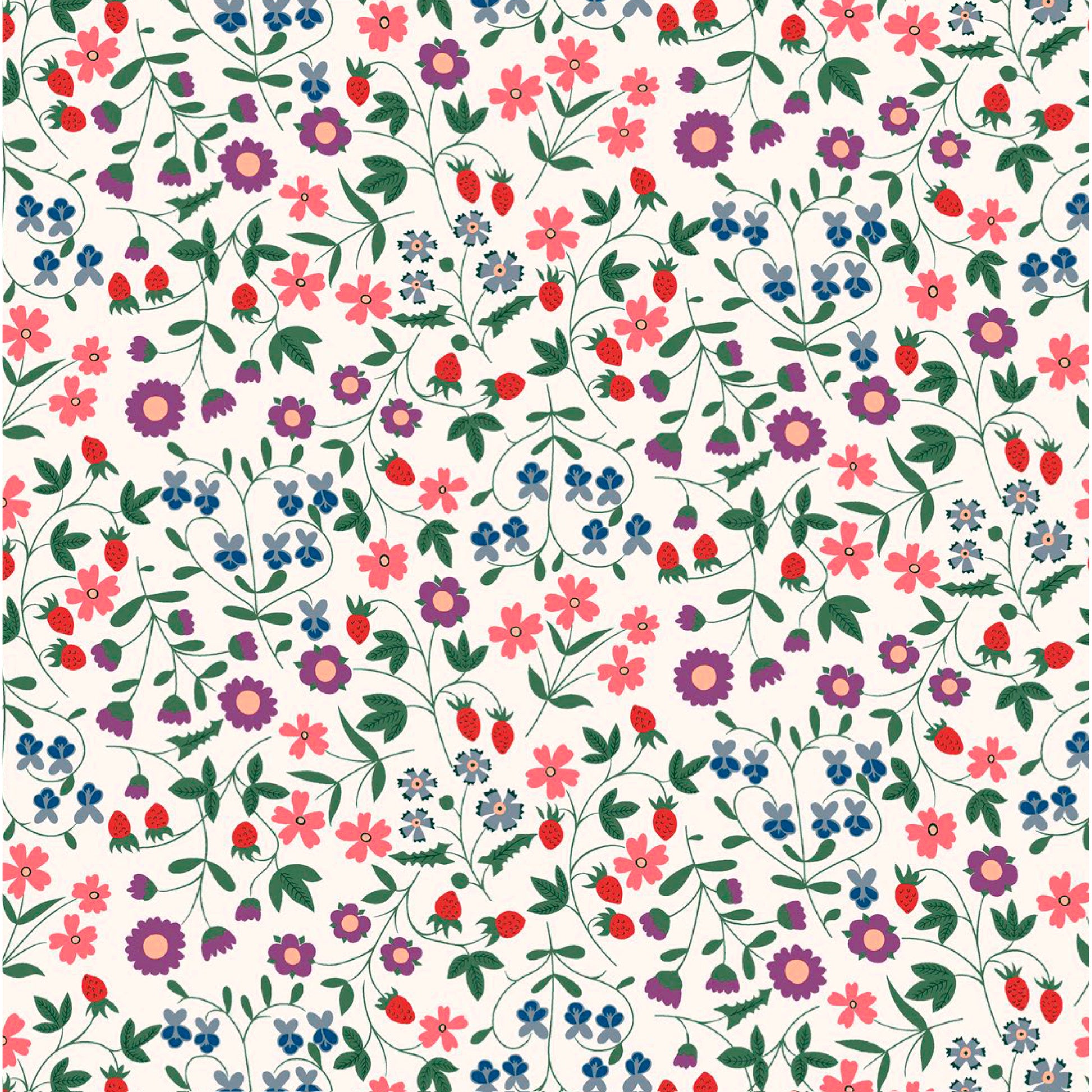 Little Mirabelle is a small-scale version of our charming Mirabelle print, originally created for Liberty in 1962. Hued in fresh and complementary tones, the pretty stylized flowers are sprinkled with tiny strawberries and trailing delicate tendrils.