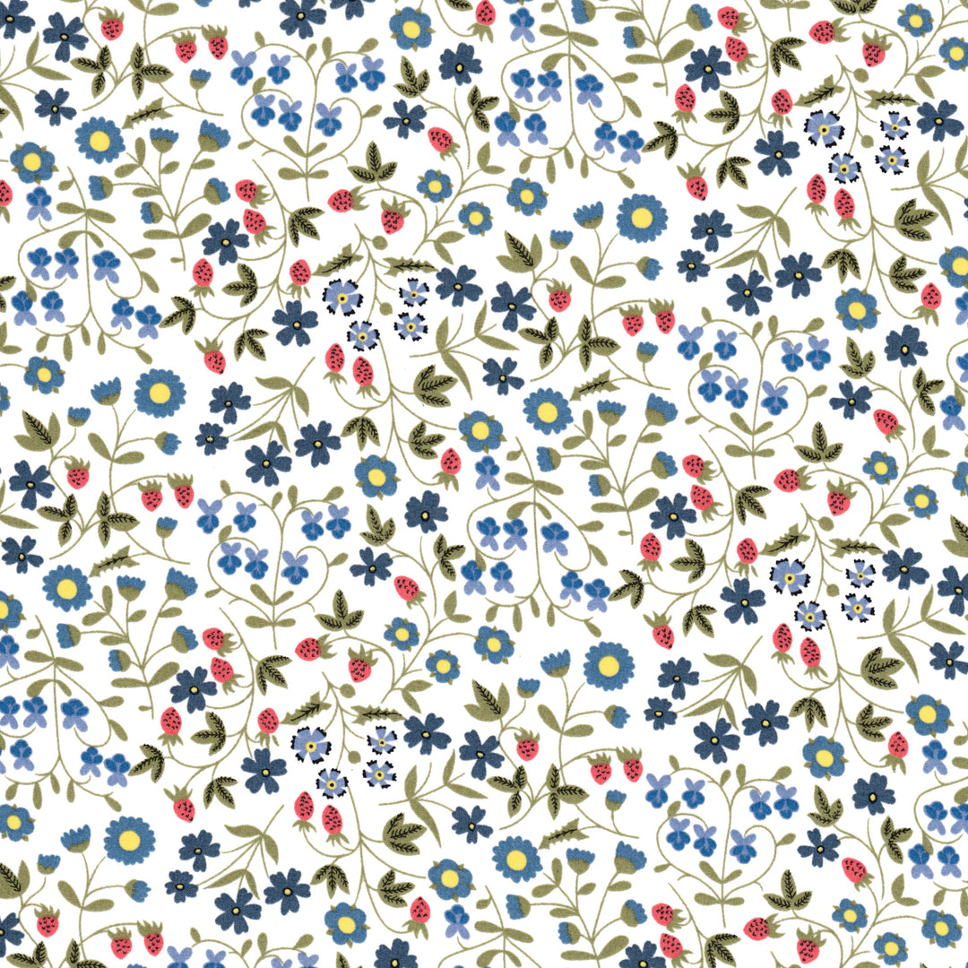 Little Mirabelle is a small-scale version of our charming Mirabelle print, originally created for Liberty in 1962. Hued in fresh and complementary tones, the pretty stylized flowers are sprinkled with tiny strawberries and trailing delicate tendrils.
