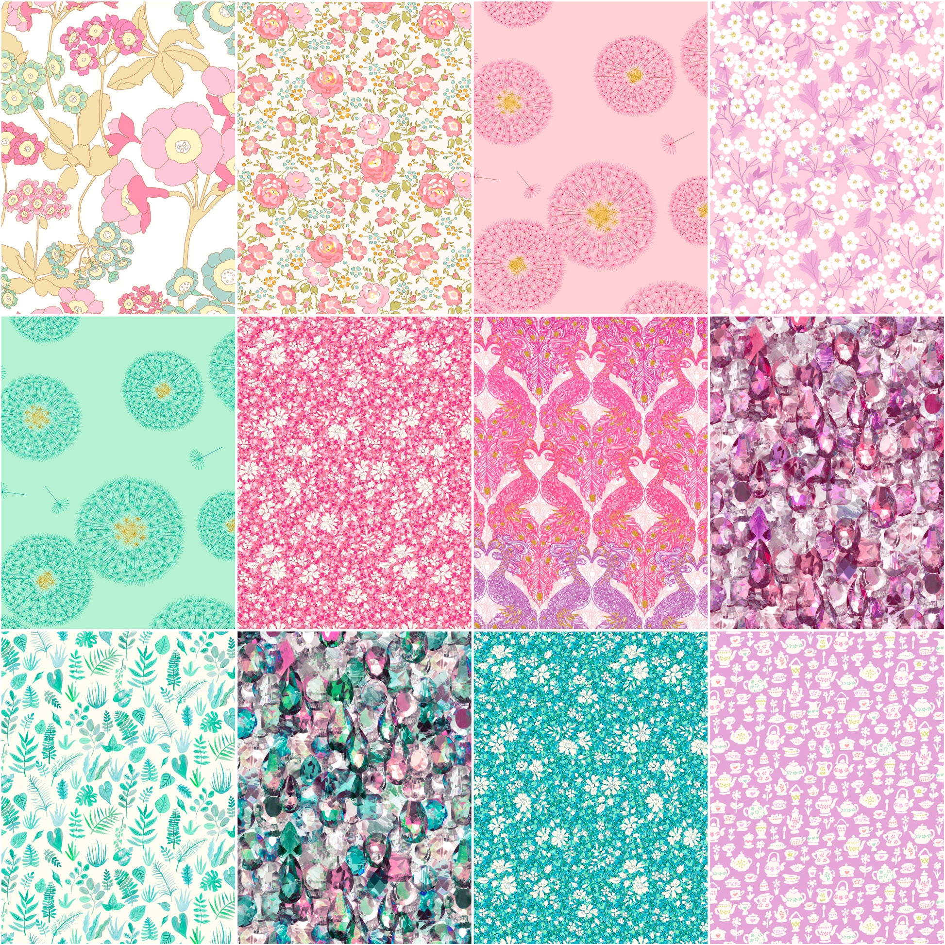 Each bundle will contain all 12 recolorings of the Sweetheart Capsule Collection. You can select between Fat Quarter, Half Yard, and Full Yard cuts.