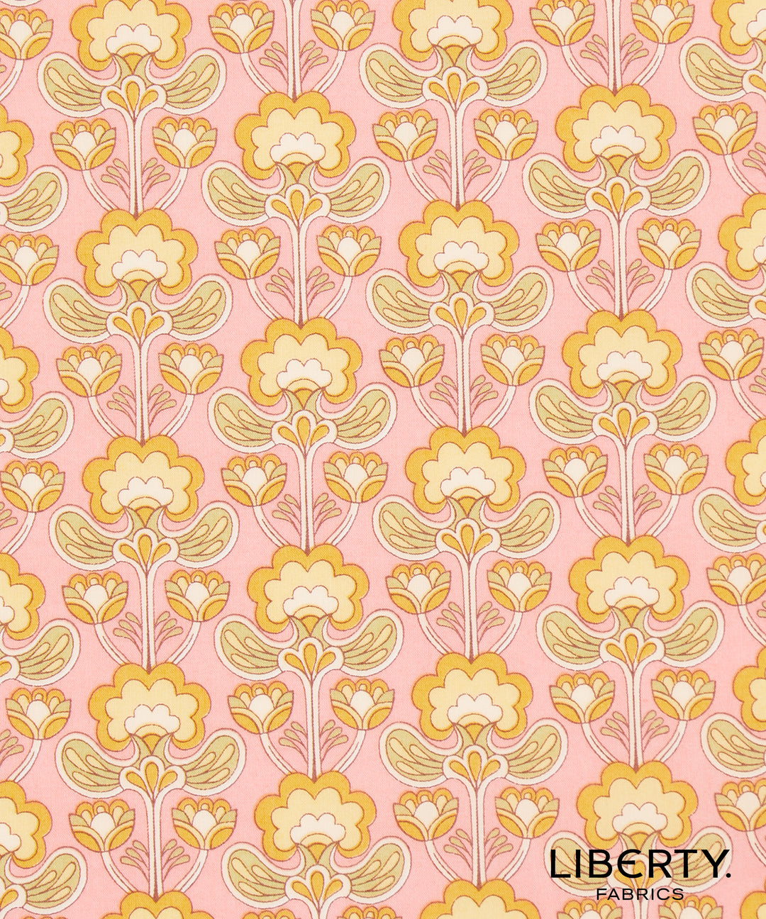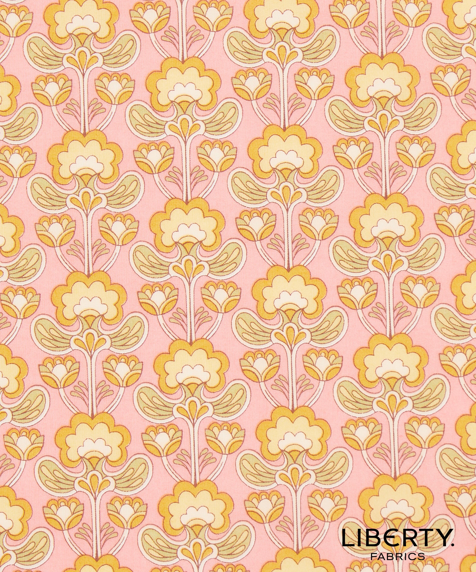 Evocative of the flamboyant fashion of the 1960s peacock revolution, this small-scale bohemian floral captures the era’s departure from traditional tailoring towards a more expressive, experimental style. Originally designed by Liberty in 1965 during the Art Nouveau revival years, Peacock Posy showcases a vibrant floral motif arranged in a strikingly graphic, repeating pattern.