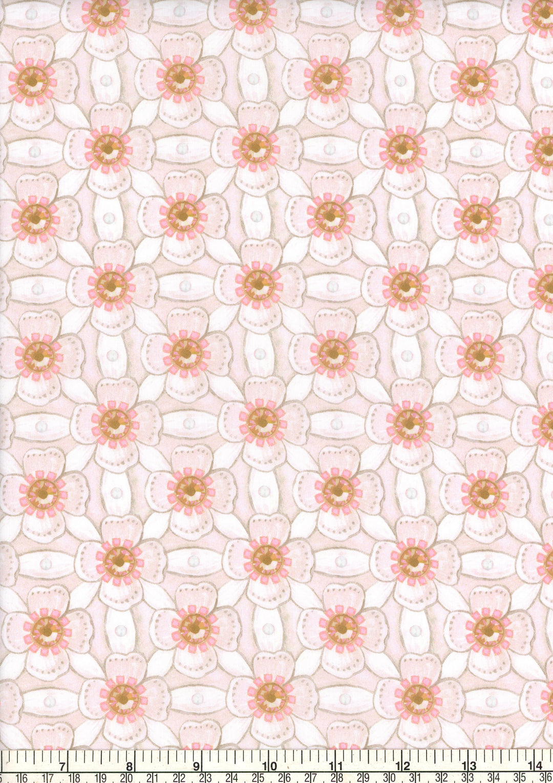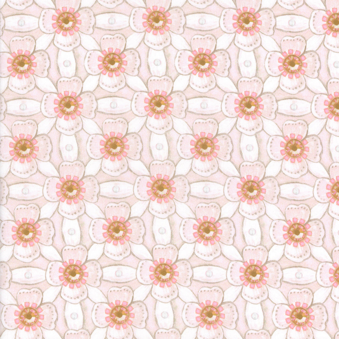 Royal Jewel was inspired by the Ditchley Portrait, a celebrated painting of Elizabeth I commemorating her time spent in Ditchley, near Oxford. Hand-painted using gouache on paper and accented with gold and silver metallic paint, this pattern echoes the opulence of embellished royal garments, reflecting the petal-like manipulation of fabric showcased in the Queen’s gown.