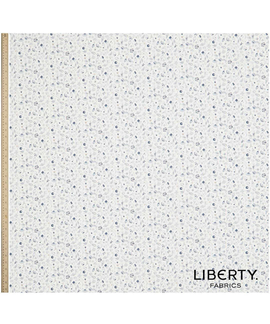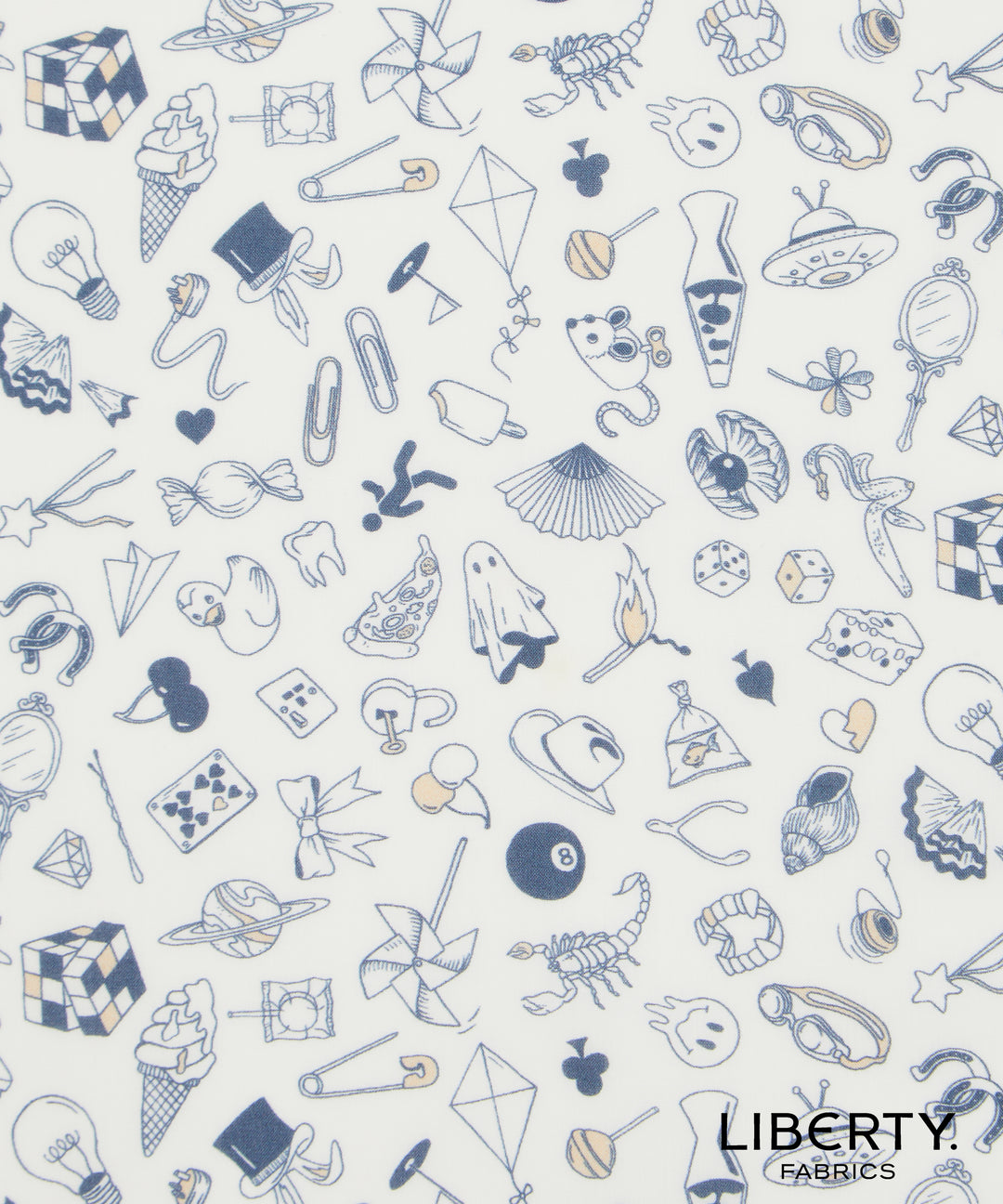 Teddy Tarrant’s fun, conversational style was inspired by tattoo artist’s flash sheets. Created in the Liberty design studio with a fine liner pen, this pattern is enhanced with bright pops of color scattered across its graphic details. A closer look reveals a whimsical array of quirky objects, including lava lamps, dice, planets, paperclips, light bulbs, and even banana peels – a true cornucopia of randomness