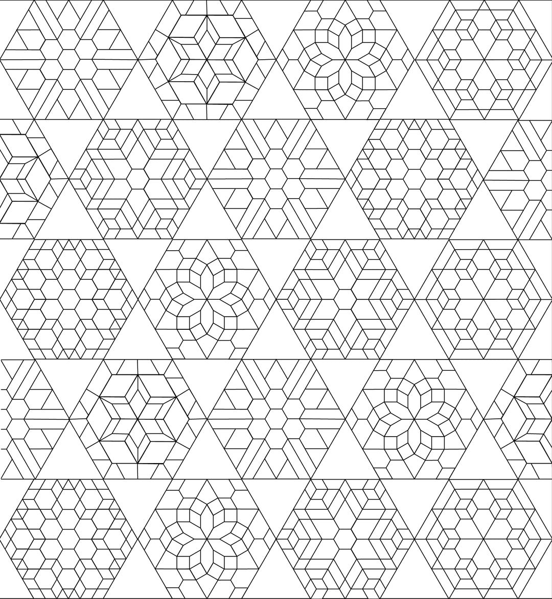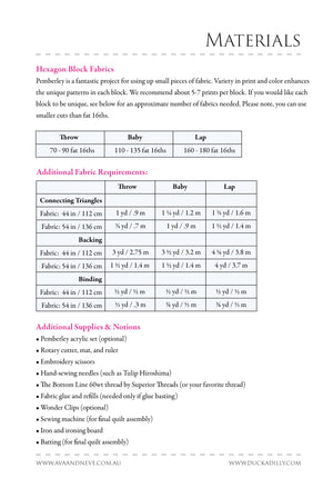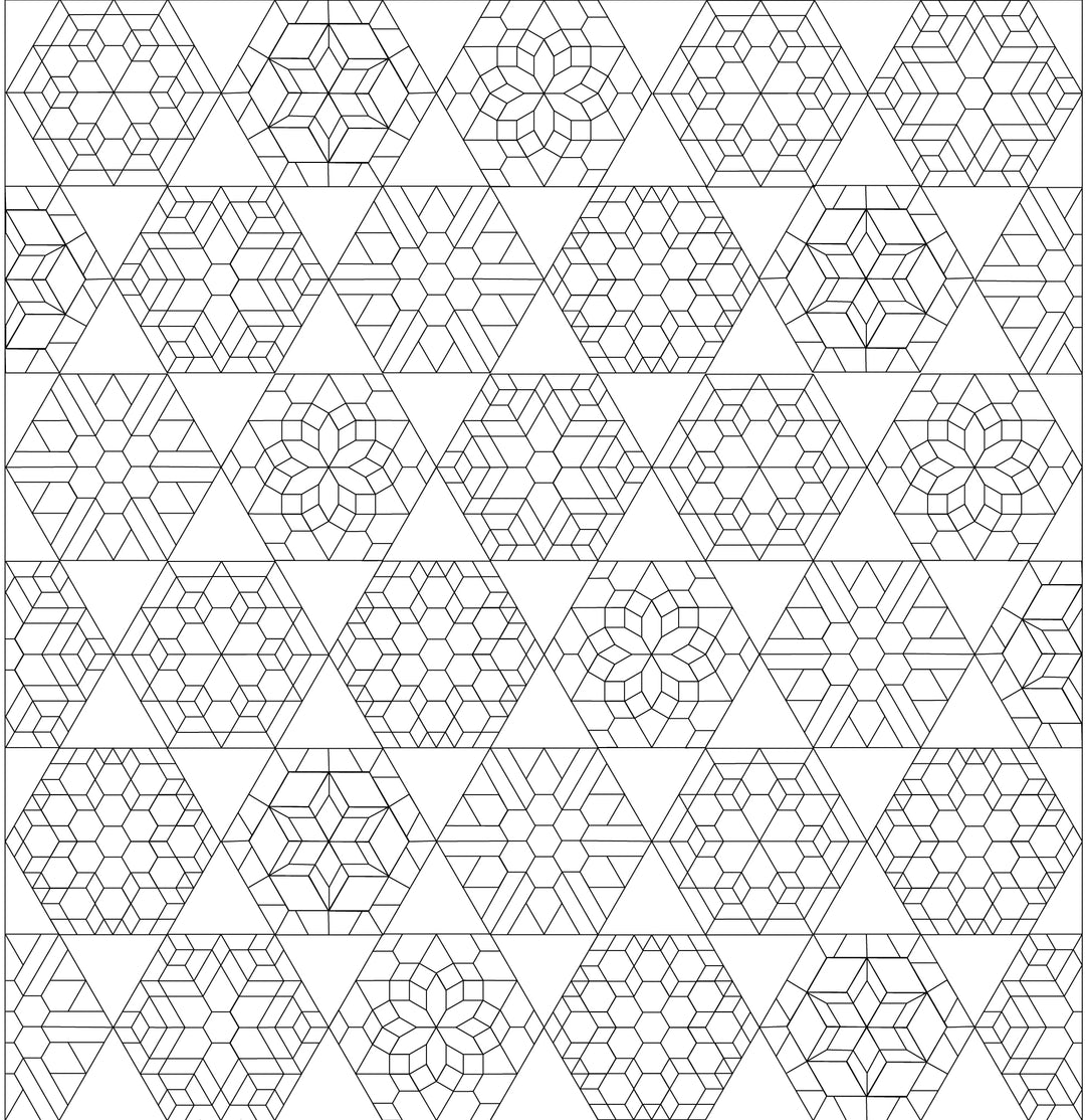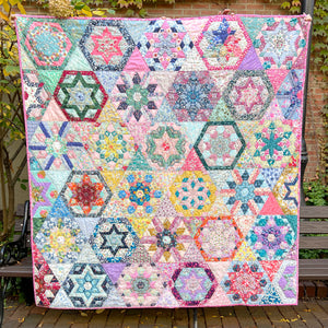 Receive PAPERS ONLY for your chosen size of Pemberley Quilt. Papers include hexagon blocks and connecting triangles. Instructions will be sent via PDF.
