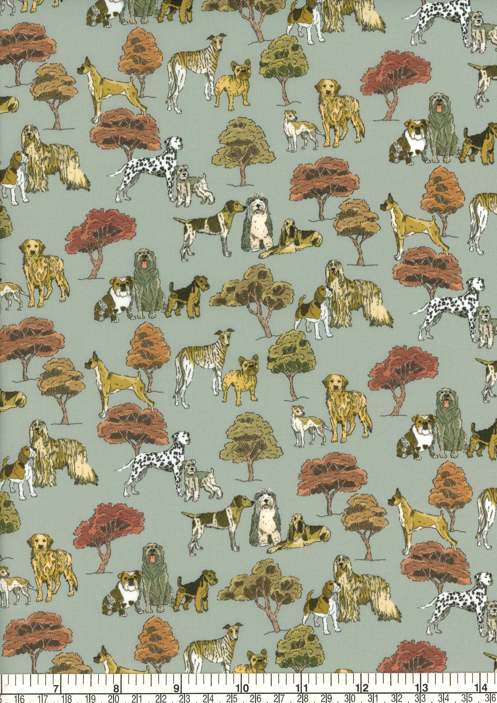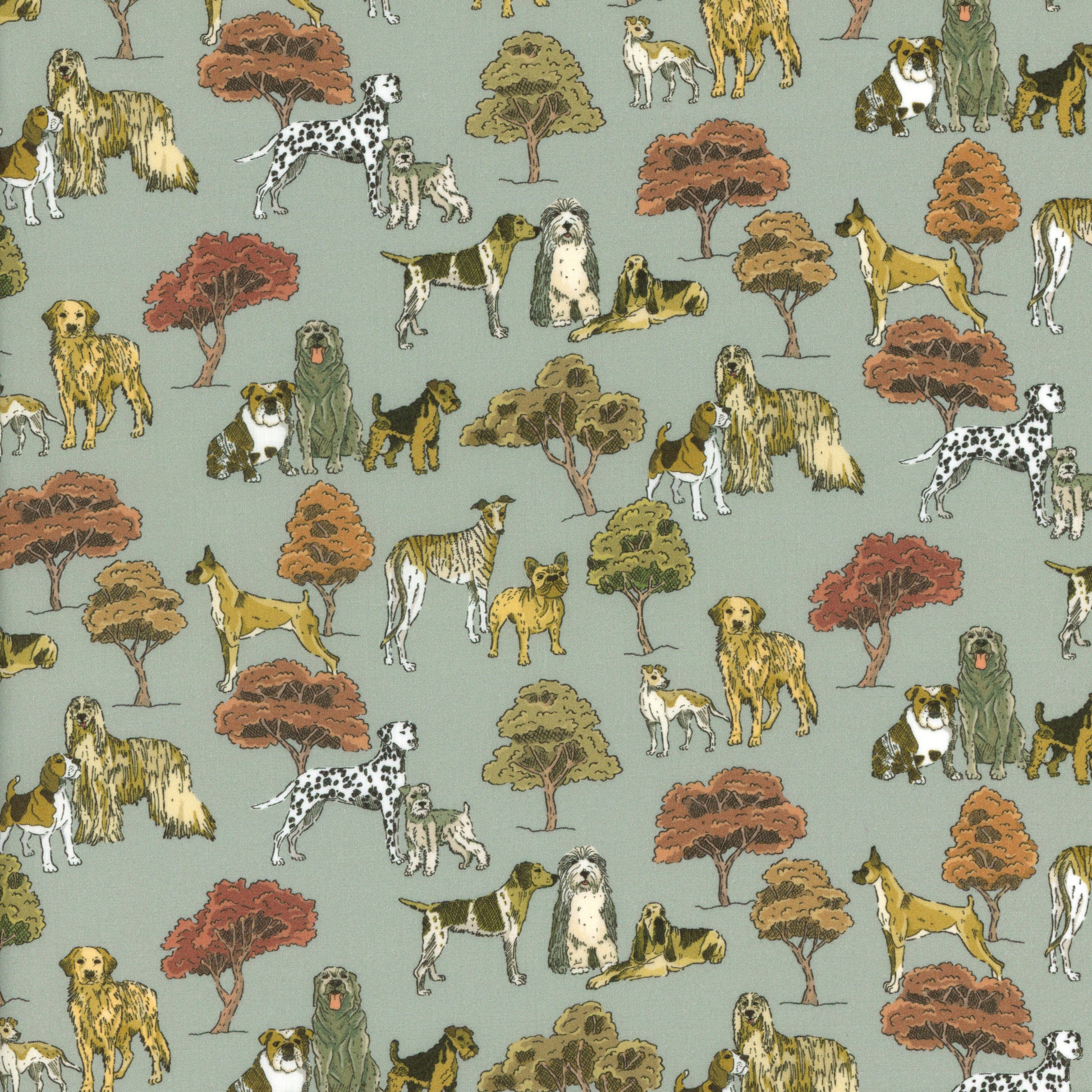 Set amongst the leafy trees of Hyde Park in London we see gatherings of majestic dogs pausing on their morning walk. Amongst the breeds captured are a Bulldog, Welsh Terrier, Labrador, Dalmatian, Boxer, Old English Sheepdog, Afgan Hound, Bloodhound, Beagle, Schnauzer, Golden Retriever, Pointer, and Greyhound. Drawn in pen and ink in the Liberty Design Studio the motifs have been coloured digitally and a bold ground, perfectly complementing these playful pooches.