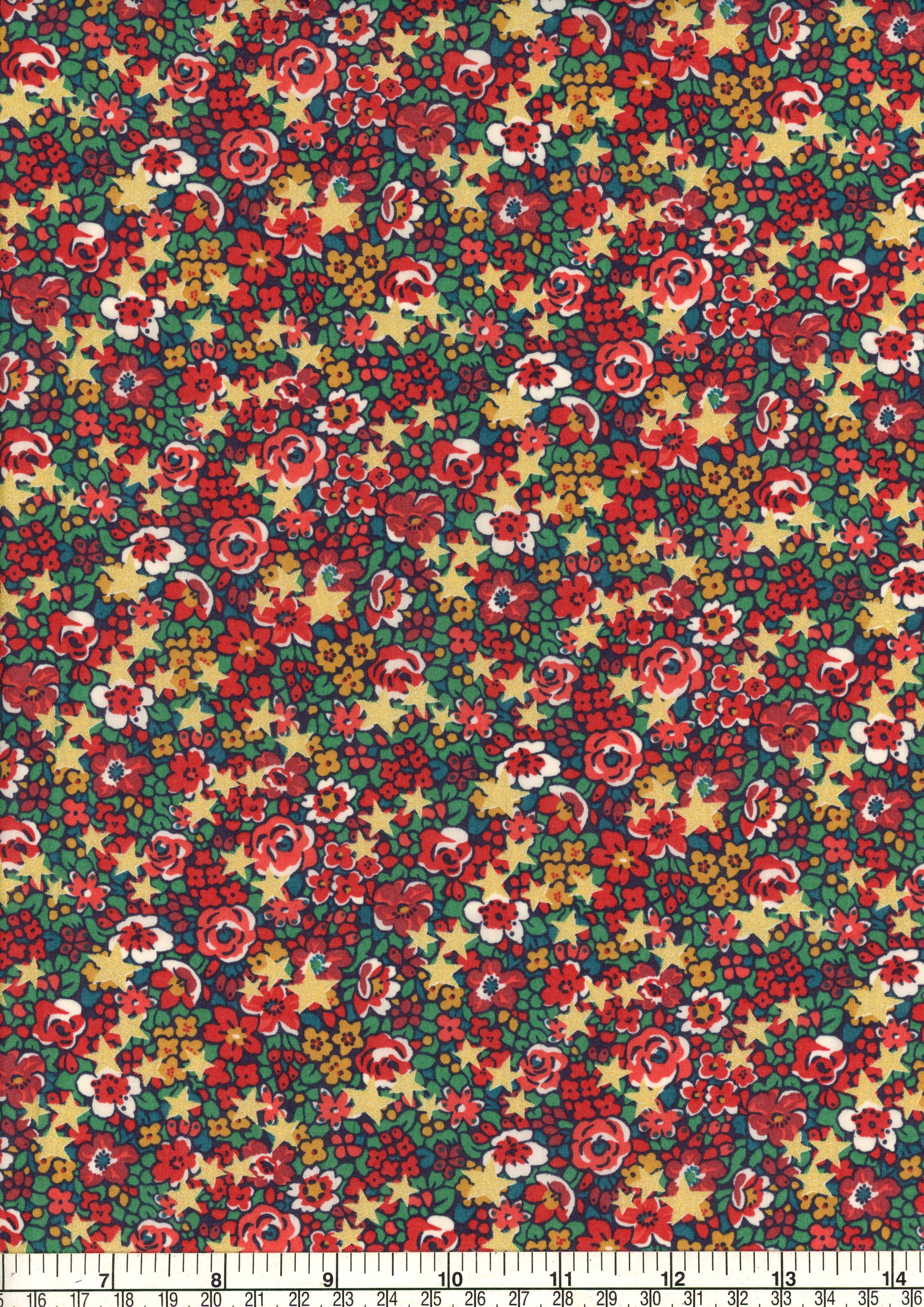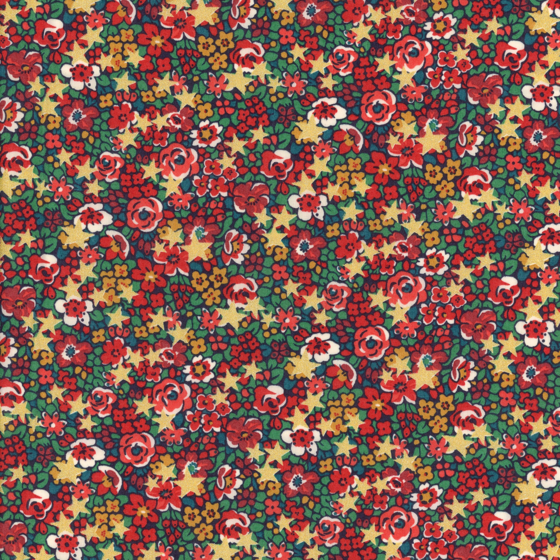 Liberty Christmas 2024. Approximately 53" wide. 100% Organic cotton, Tana Lawn®. This fabric features metallic gold stars.