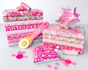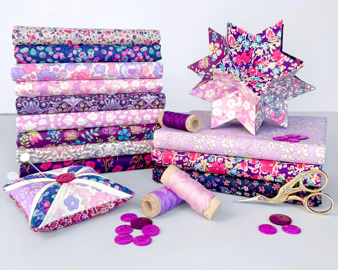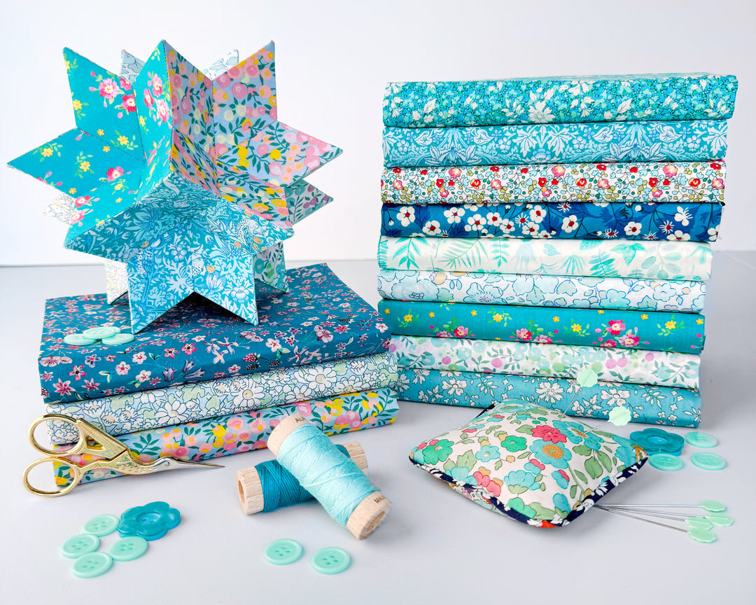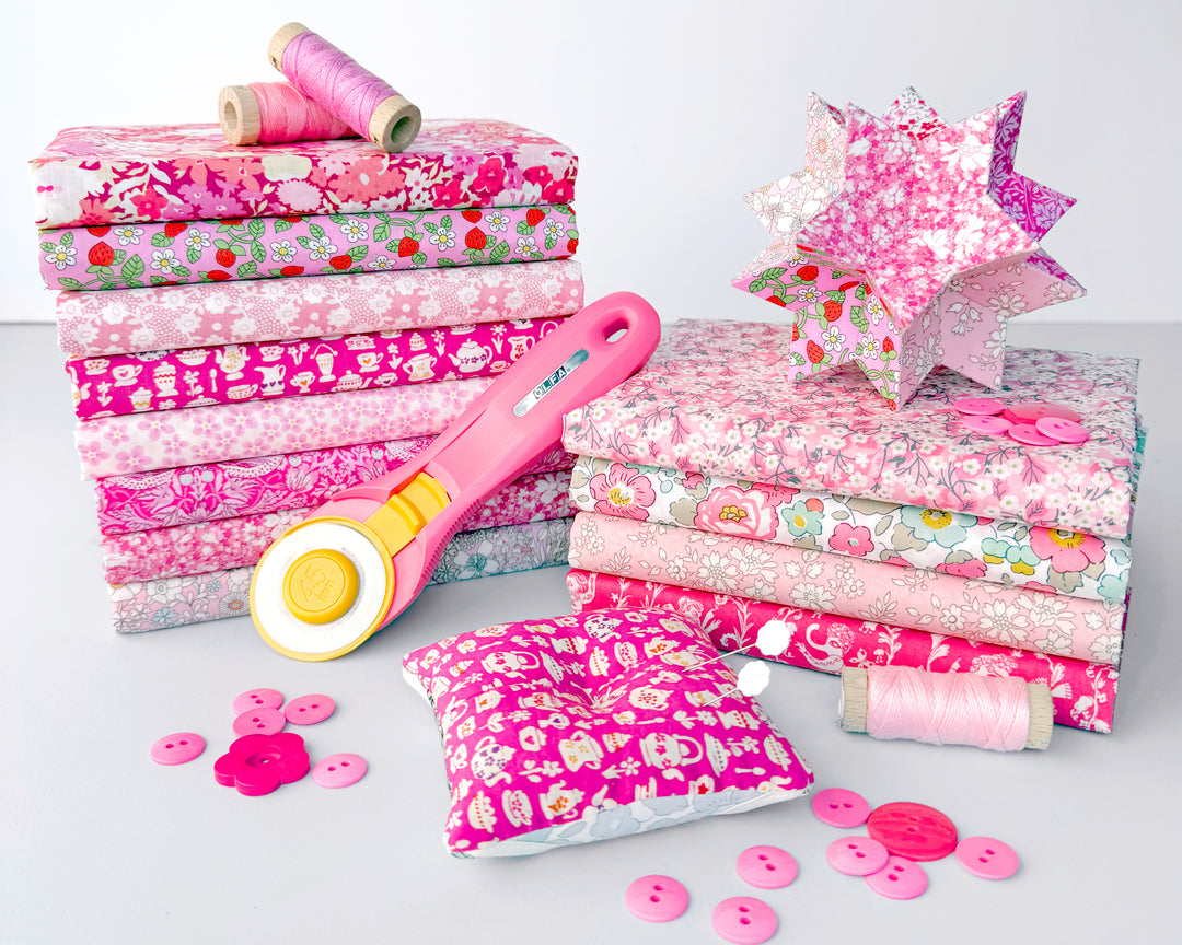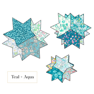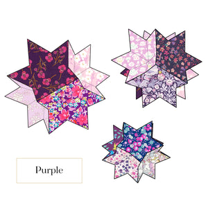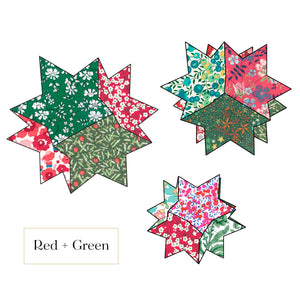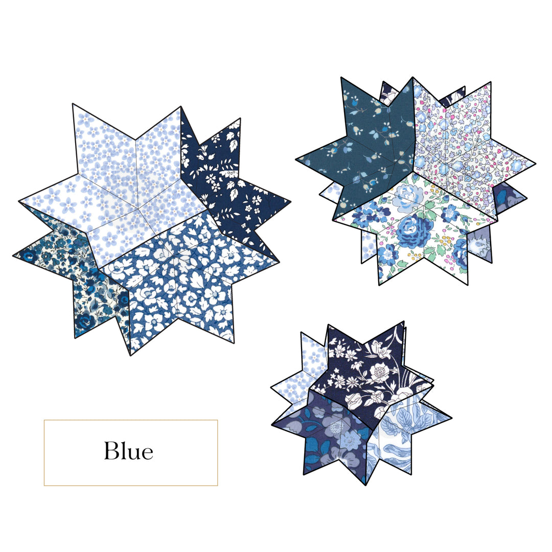 You will receive all of the pre-cut papers to create 3 Moravian stars (small, medium large). You will also receive 12 Fat 16ths fabrics in your choice of color. Each Fat 16th measures approximately 9" x 12.5".