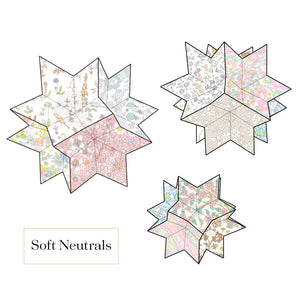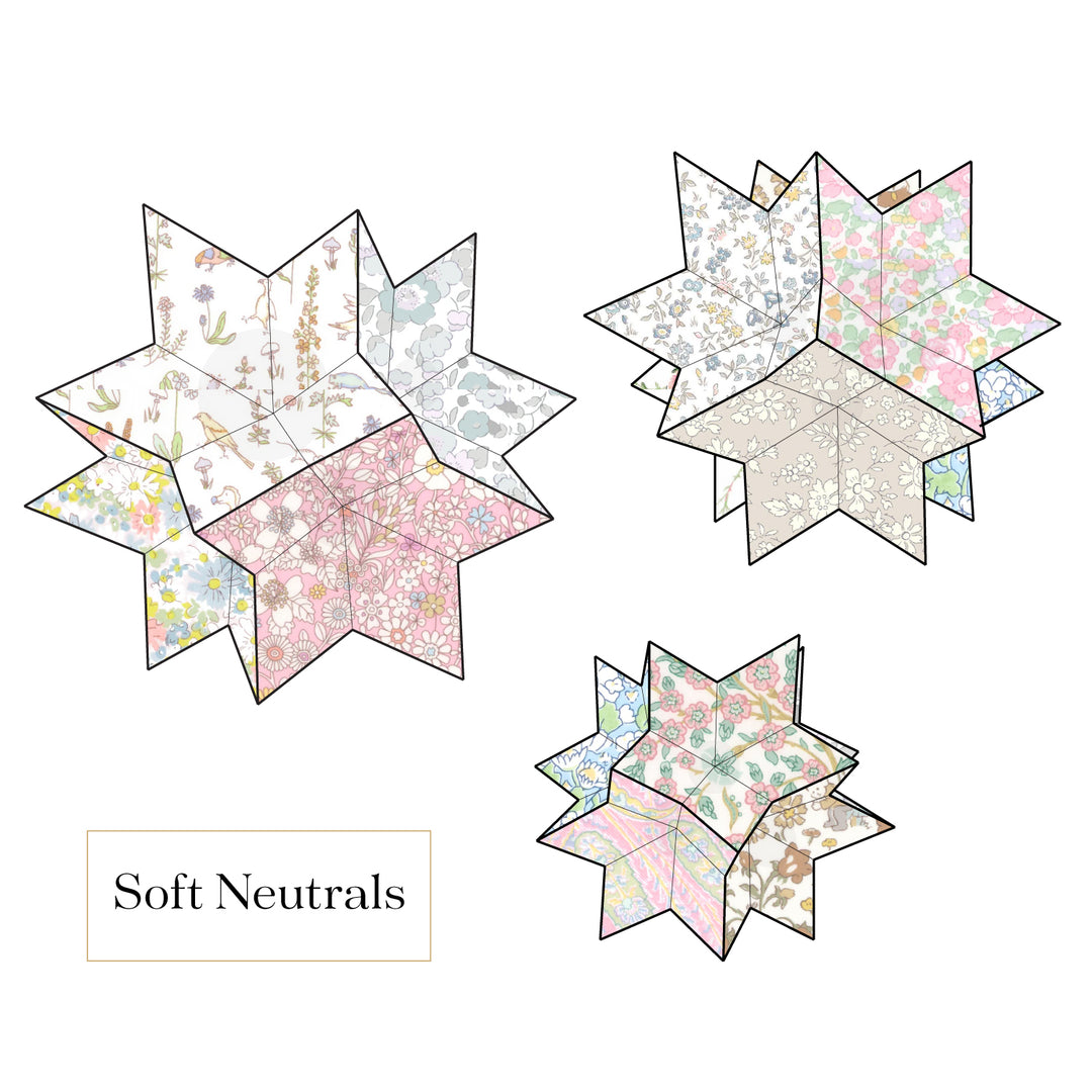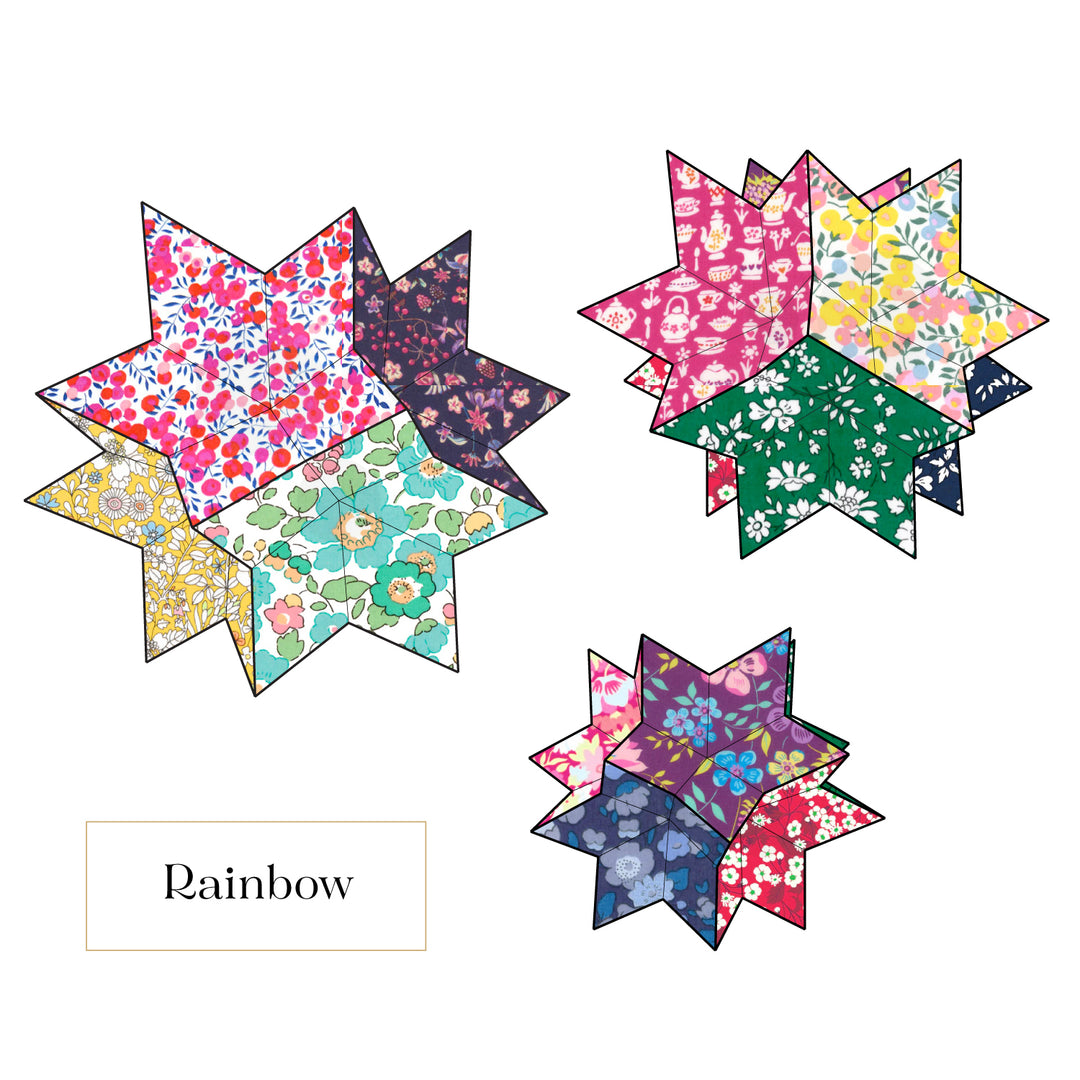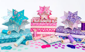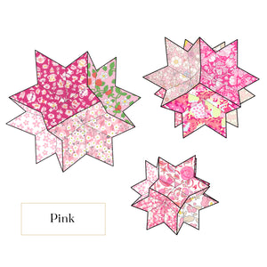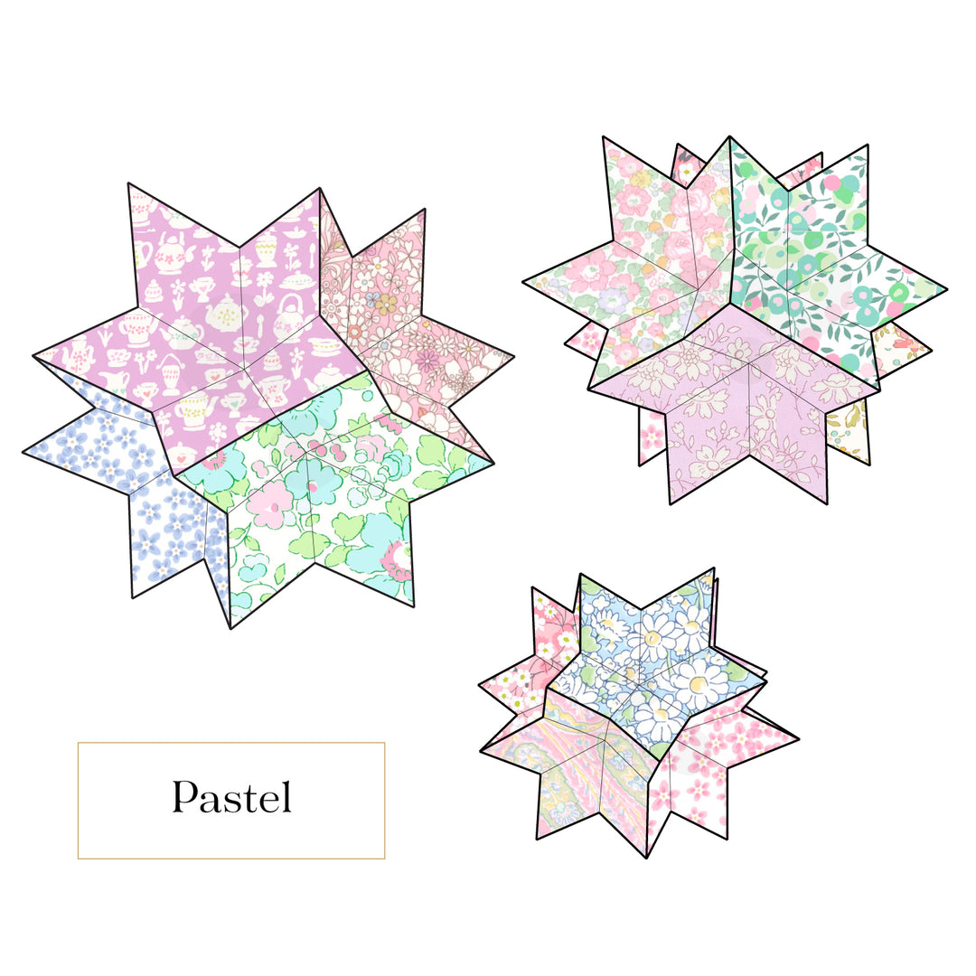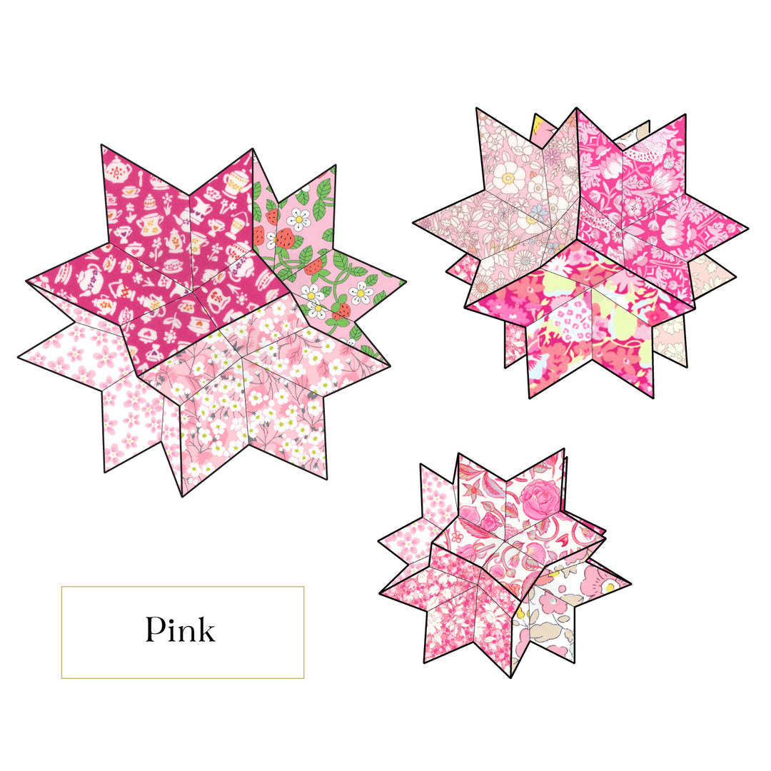 The Moravian Star Kit makes 3 three-dimensional English Paper Pieced stars, perfect for ornaments or as decorations. The stars are assembled using 60-degree paper diamonds. The paper pieces remain inside of the ornaments, giving the star its shape. The kit contains papers to make a three star sizes: small, medium, and large.