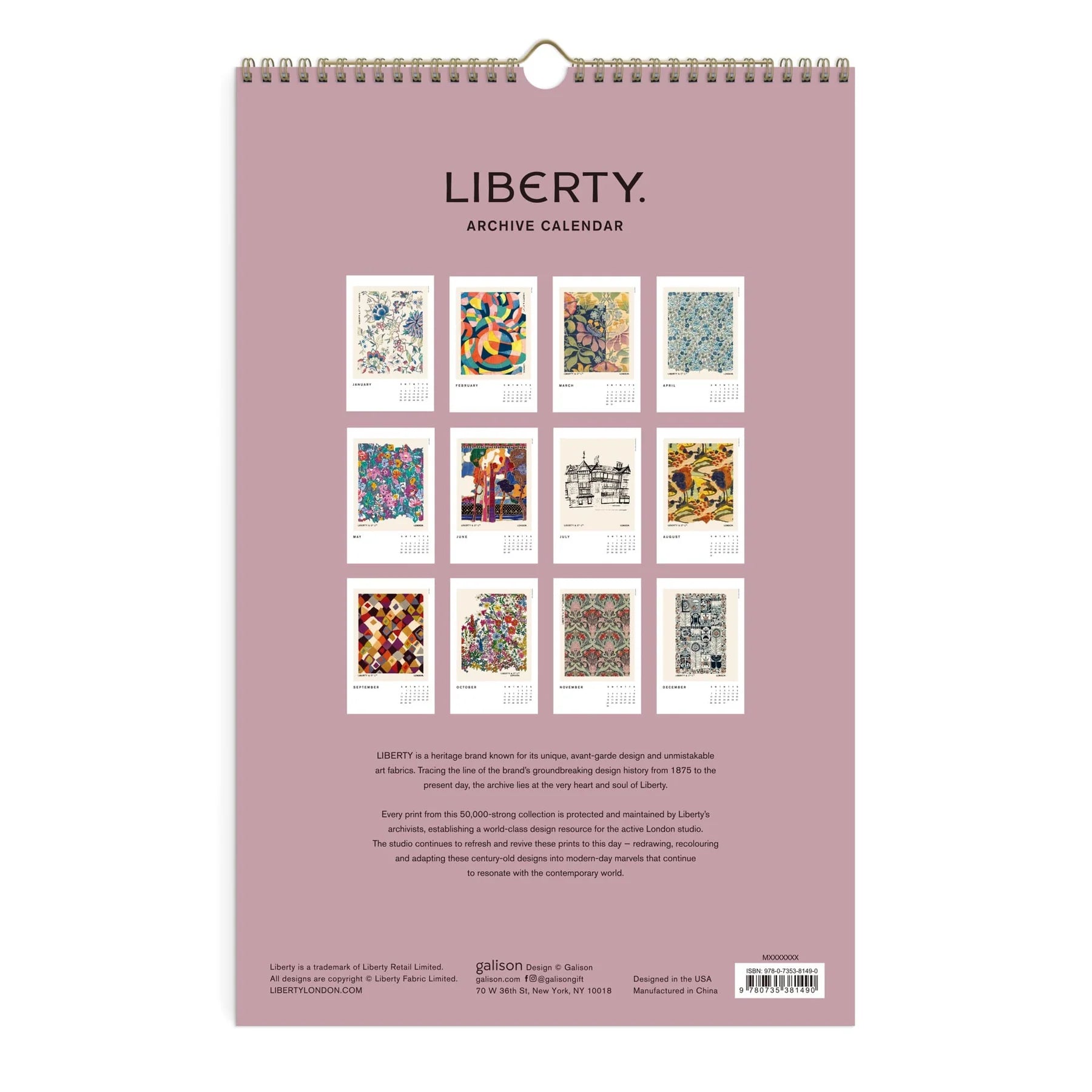 The Liberty 2025 Wall Calendar is perfect for any tourist, print, or Liberty lover! Liberty London is known for its floral and graphic prints and the offering of innovative and eclectic designs. This beautifully designed printed on high-quality paper stock features 12 months of unique designs from this iconic brand. It includes a wire-o binding with hanging bar for easy display.