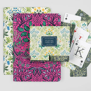 William Morris is well known for his unmistakable tapestries, furniture, fabrics, wall paper and even stained glass. His work has now been used for over 150 years on many more decorative as well as functional products. The William Morris Playing Card Set features two standard size decks of playing cards in the famous Celandine and Seaweed designs. Each deck is in its own colorful box for safe keeping and the 2 sets are packaged in a keepsake drawer box.