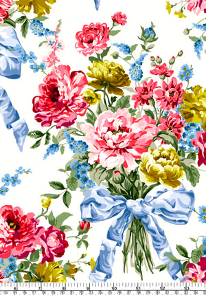 Assembled from an array of botanical prints unearthed in the Liberty archive, Bow Bouquet celebrates the kaleidoscope of colours and the splendour of nature’s beauty, boasting a symphony of opulent blooms. Echoing the grandeur of the Regency era, this theatrical pattern features roses, peonies, asters, lilacs, and larkspur, forming breath-taking bouquets delicately bound together with silk satin bows.