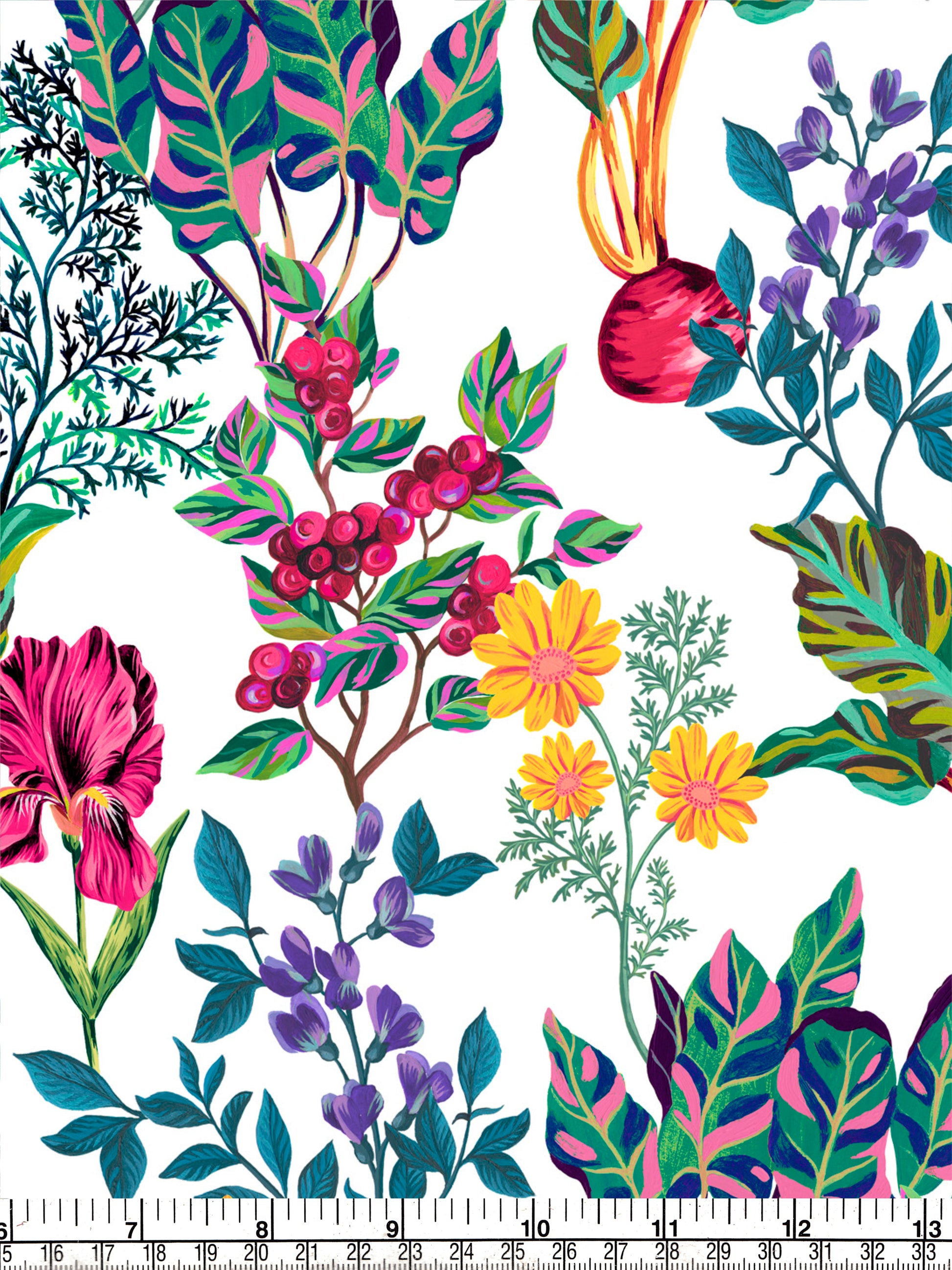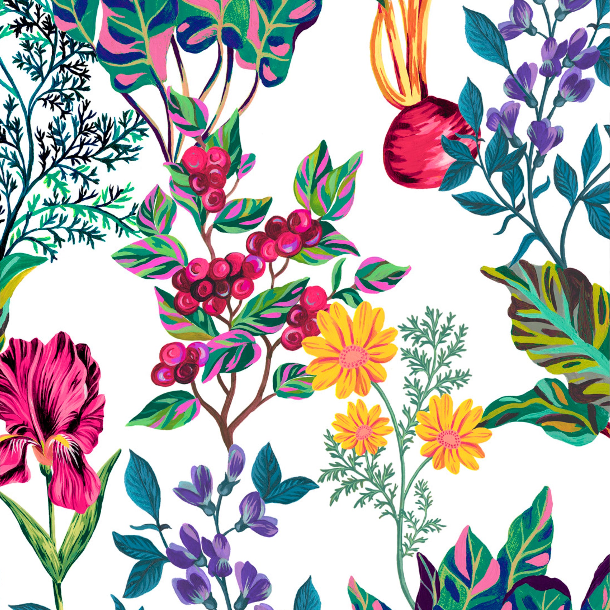 In Pigment Patch, each colour of the rainbow is represented by a flower, fruit or vegetable that is tradi- tionally used in natural dyeing. Foliage and food such as beetroot, blueberries and iris flowers appear in gouache, growing around each other to create a large-scale floral design.