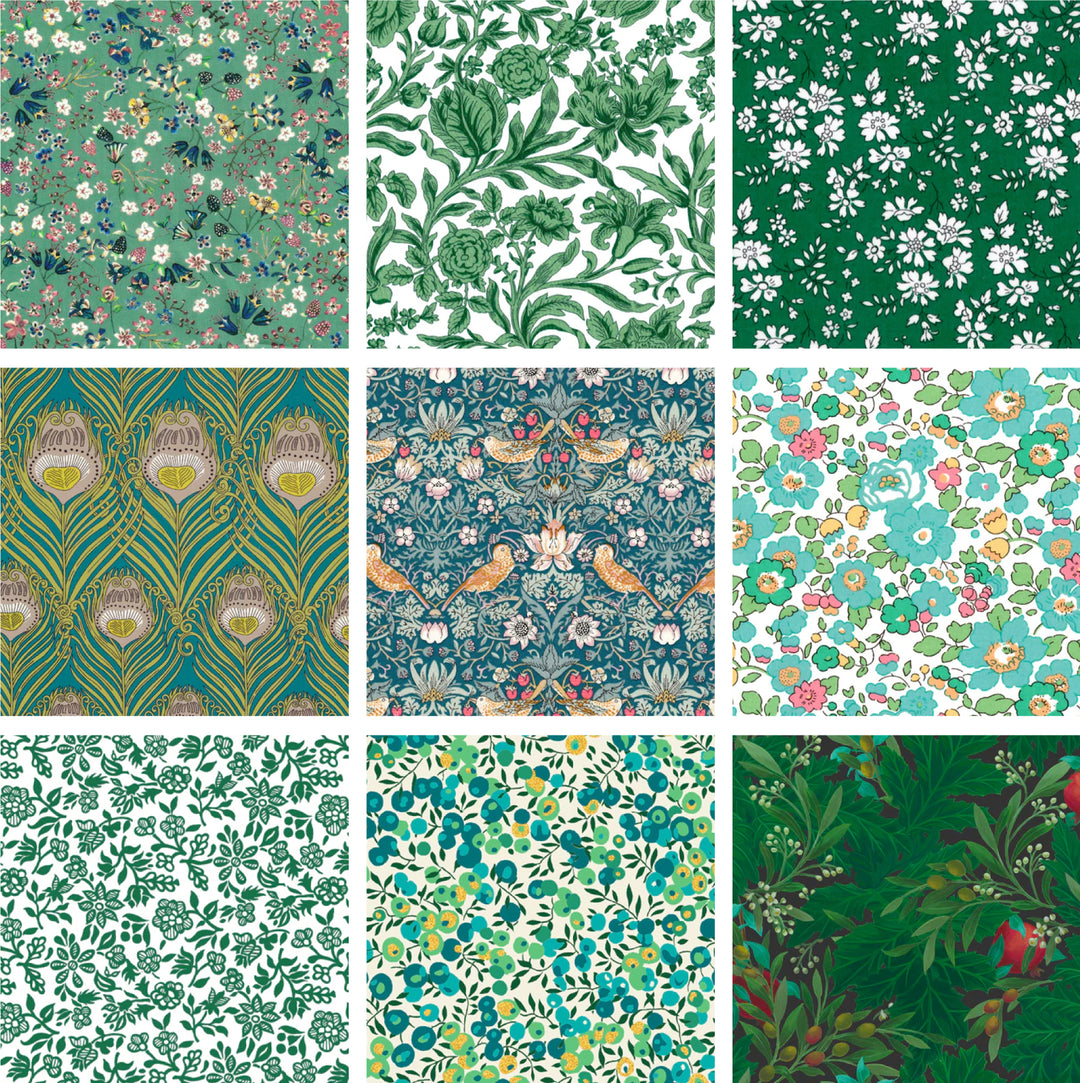 A lovely selection of Liberty Fabrics Tana Lawn. Included are 36 squares in nine different prints (four of each print). Squares are all carefully cut by hand. 100% cotton, Liberty Fabrics Tana Lawn®.