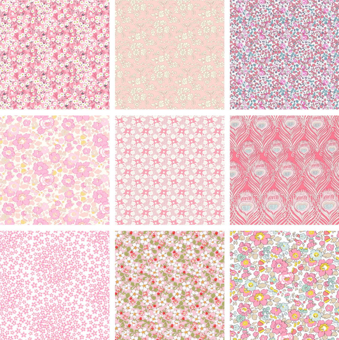 A lovely selection of Liberty Fabrics Tana Lawn. Included are 36 squares in nine different prints (four of each print). Squares are all carefully cut by hand. 100% cotton, Liberty Fabrics Tana Lawn®.
