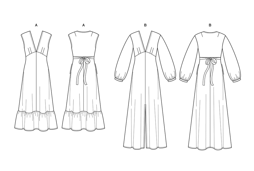 The Beatrix Maxi Dress creates a fluid slit V-neck silhouette with variable sleeve and ruffle options – a versatile style with free-spirited ‘70s appeal.