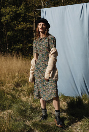 The Bella Tea Dress creates a streamlined style with a structured waist and puffed sleeves – a ‘40s-inflected silhouette with all-modern charms.