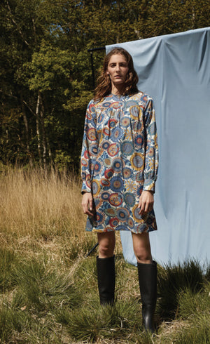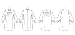 The Bertie Shirt Dress creates a loose-fitting gathered-cuff style with voluminous sleeves and a stand-up collar option – a cool and comfortable silhouette for everyday wear.