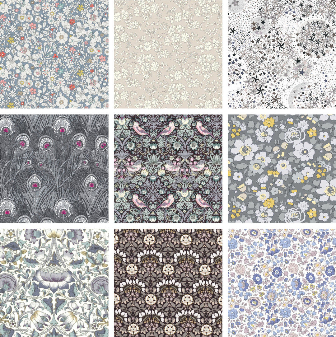 A lovely selection of Liberty Fabrics Tana Lawn. Included are 36 squares in nine different prints (four of each print). Squares are all carefully cut by hand. 100% cotton, Liberty Fabrics Tana Lawn®.