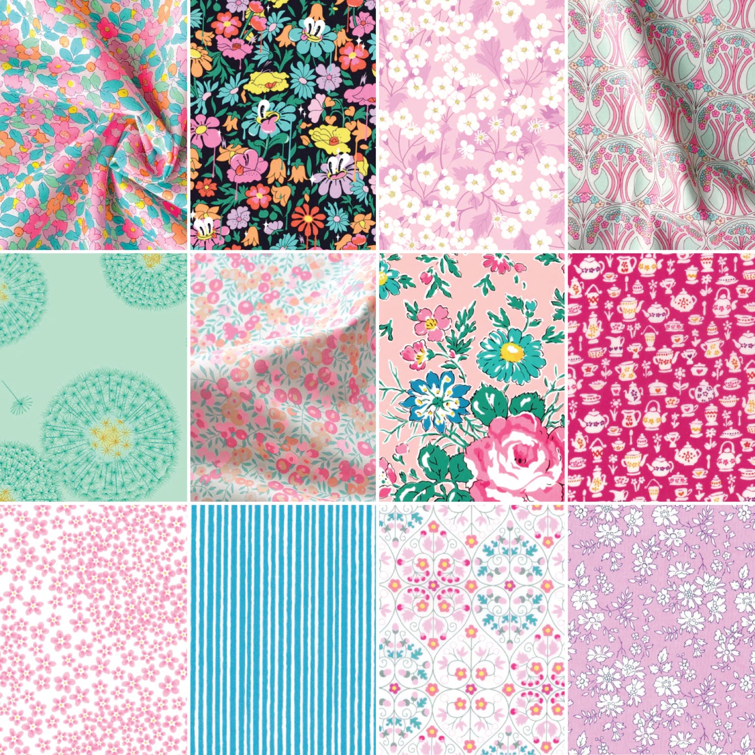 Perfect for quilting and small projects. Each pack of fabric contains 12 prints, as shown in the photograph. 100% Cotton, Liberty of London Tana Lawn.