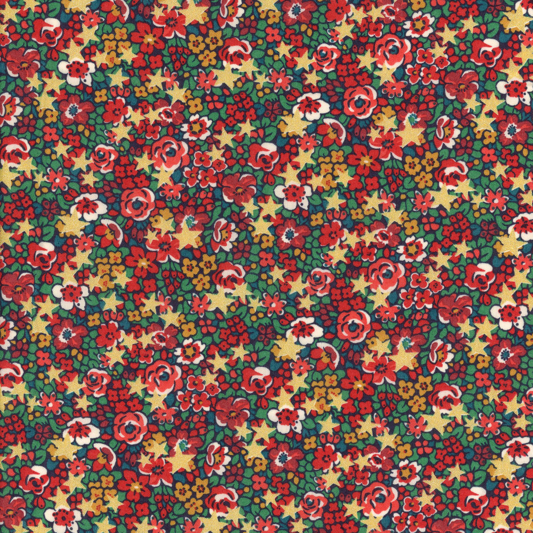 Liberty Christmas 2024. Approximately 53" wide. 100% Organic cotton, Tana Lawn®. This fabric features metallic gold stars.
