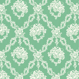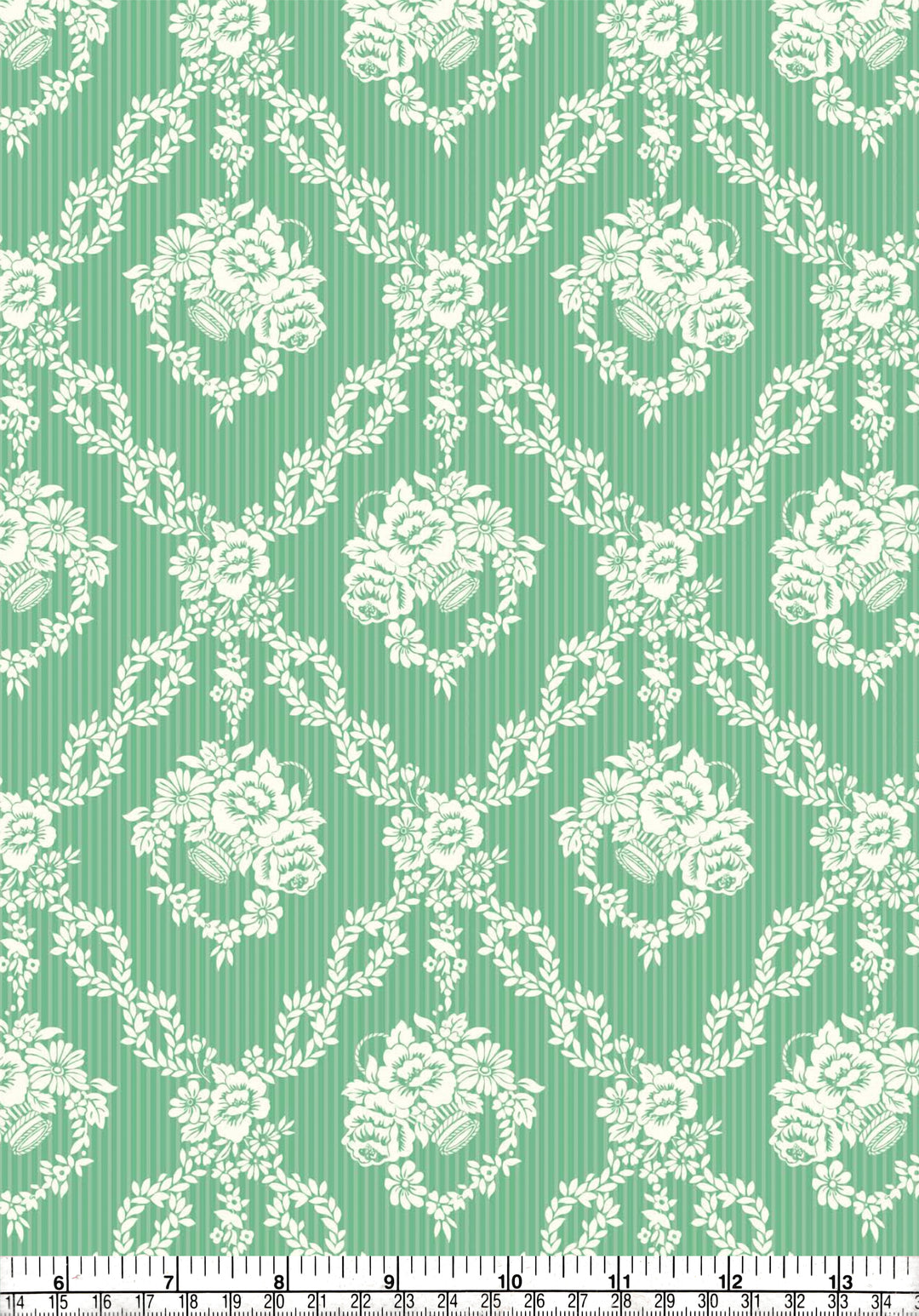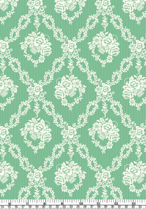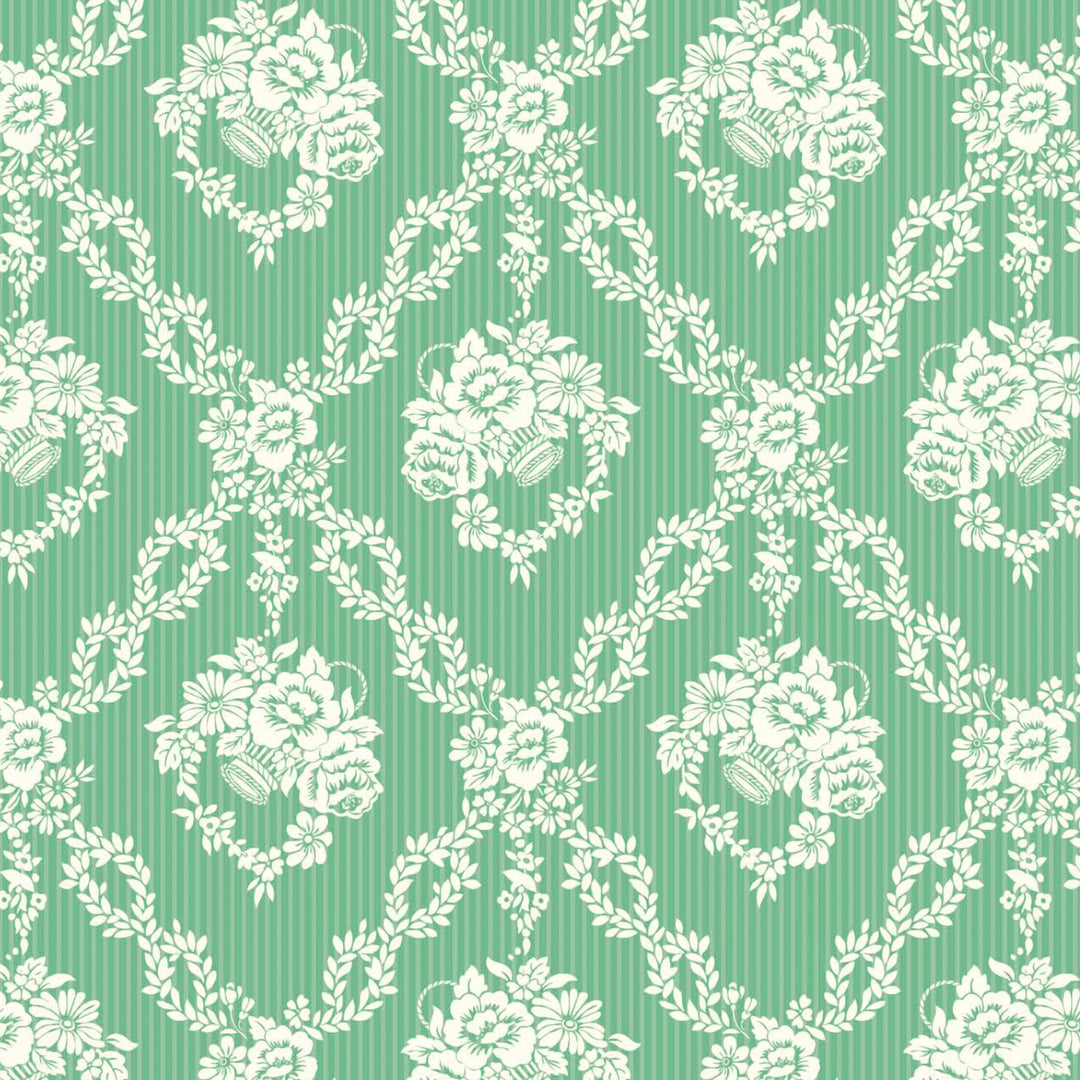 Designed from a series of archival silk fragments discovered in a 1920s Liberty pattern book, Garland Hampers captures the essence of damask wallpapers and upholstery fabrics traditionally printed in the 18th and 19th centuries. Its intricate floral hamper baskets, encircled by diagonal leafy wreaths are set against a subtle stripe backdrop, which evoke a timeless blend of classical elegance and contemporary finesse.