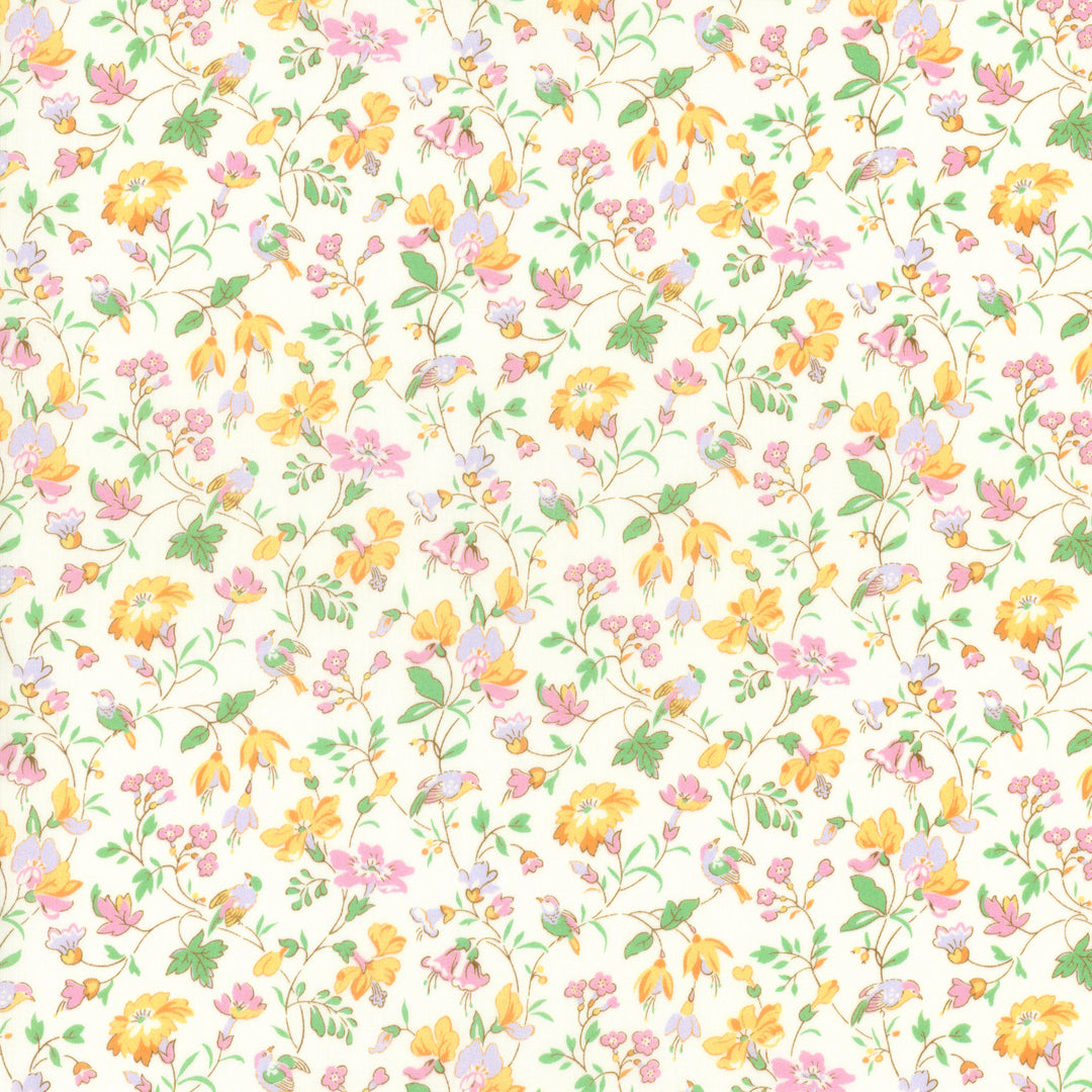 Originally hand-painted in the early 1990s, Iveta’s Garden was inspired by the delicate linework typically found in 1920s Liberty pattern books. Gently cascading in the soft summer breeze, this romantic garden features trailing flowers of hibiscus, fuchsia, primrose and sweet pea. Look closely to distinguish tiny camouflaged birds gracefully nestled among the blossoming branches.