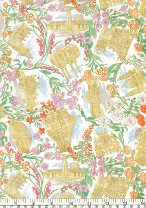 Originally inspired by a scarf pattern discovered in the Liberty archive, this design portrays the beautiful and varied architecture of London, framed by a selection of glorious British wildflowers. The illustrations were hand drawn in the Liberty studio and a texture was added to evoke the nostalgic charm of a vintage scarf.