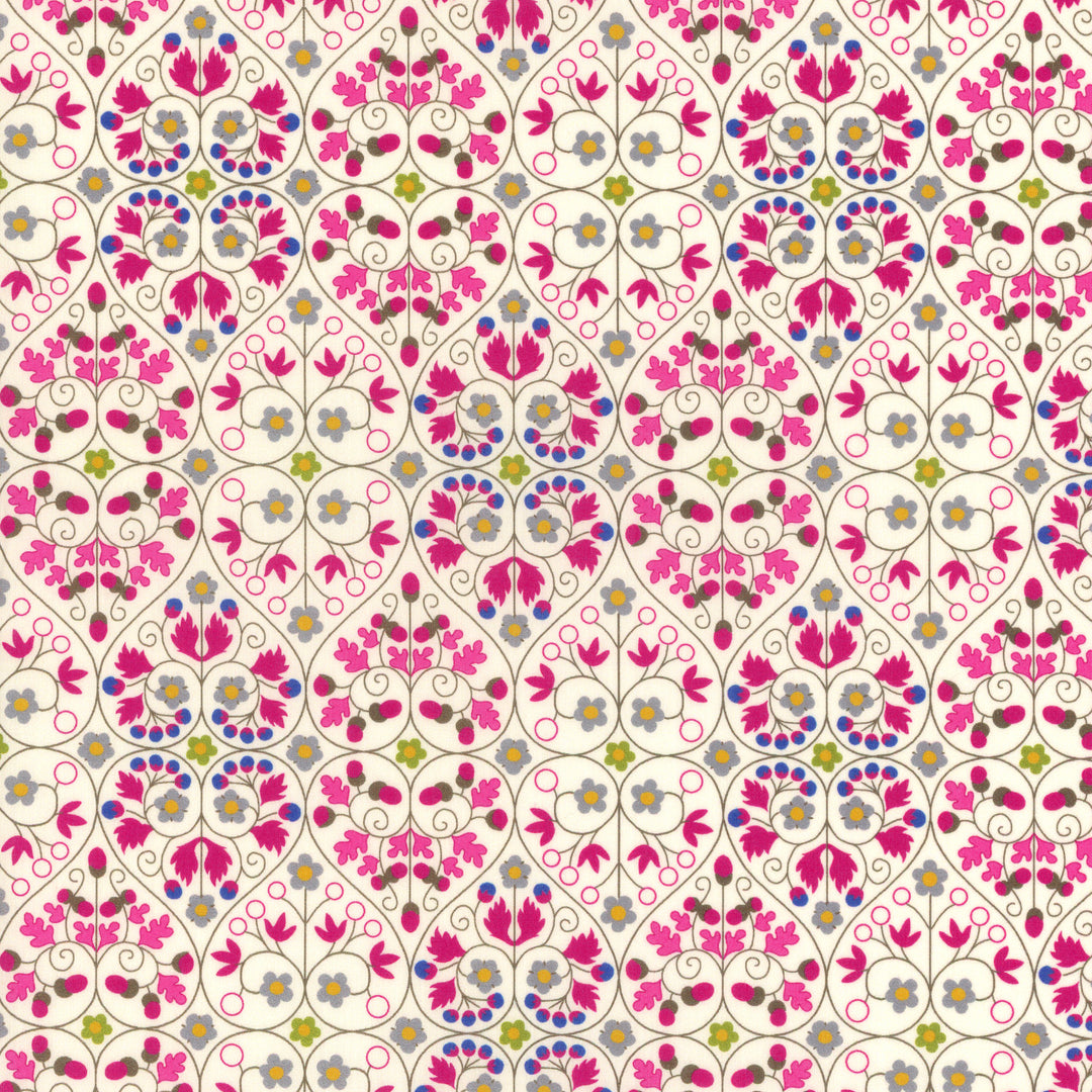 A heart shaped floral check with stylised flowers, trailing leaves and tiny acorns. Inspired by a 1961 Liberty archive print, Delfie is reminiscent of wrought iron swirls and decorative garden gate panels.