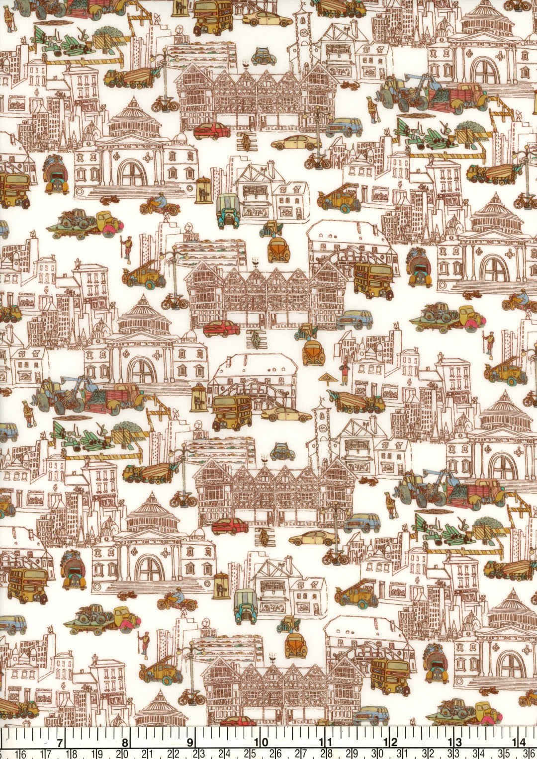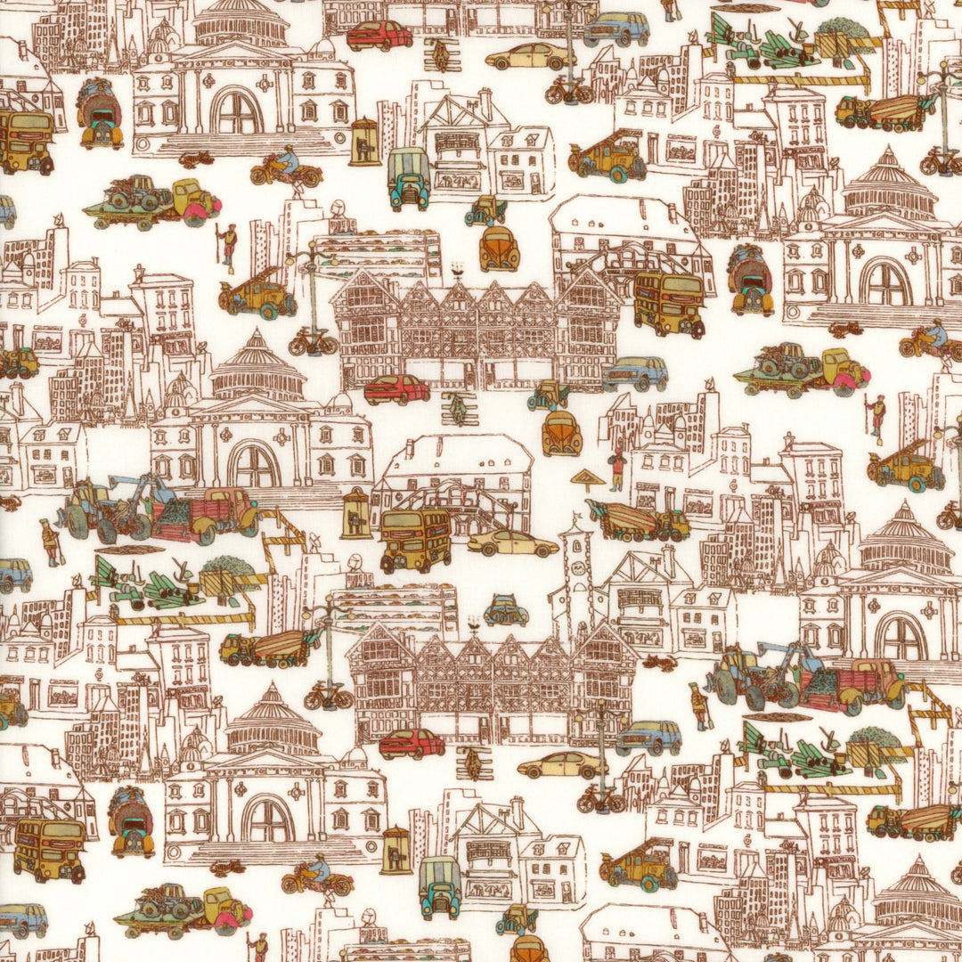 Extraordinary renderings of buildings, machines and even the timber framed Liberty building characterfully populate this London cityscape. The Liberty Design Team extracted and rearranged motifs from their original square formation to make a wearable conversational design spotlighting an array of colourful city sights, from roadworks to lampposts and iconic red buses.