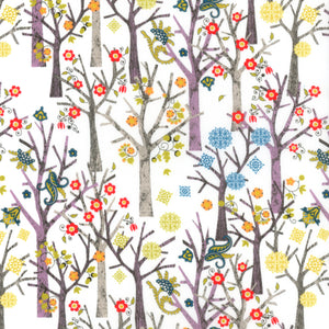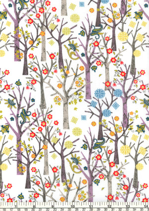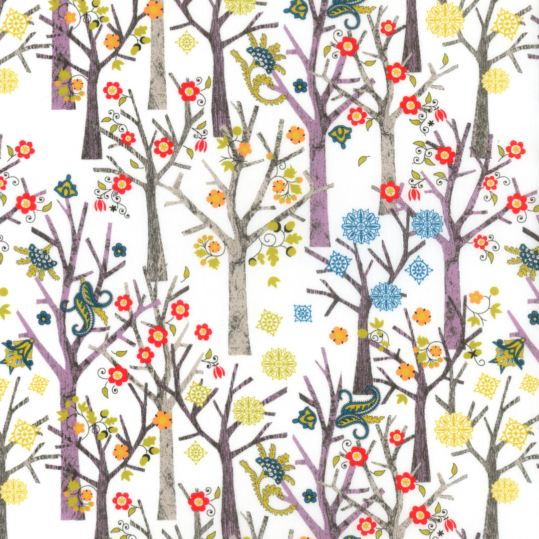 Tuesday Trees is an original design created in 2009 by multi award-winning children’s author and illustrator Lauren Child CBE. Inspired by Lauren’s illustration of the much loved fictional character ‘Clarice Bean’, this joyful print combines fragments of archival Liberty patterns, together with delicately textured trees. A beautifully assembled and collaged Liberty fairy tale forest!
