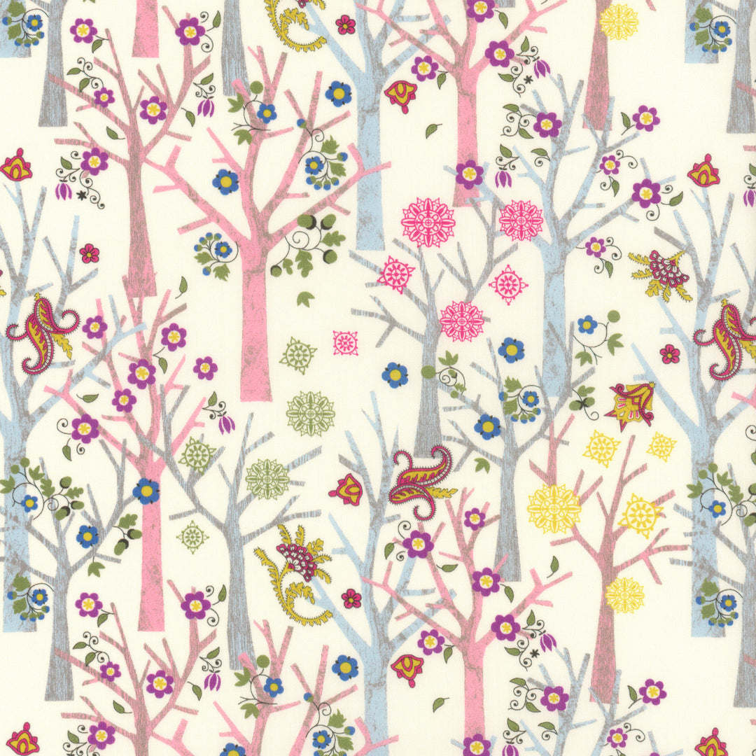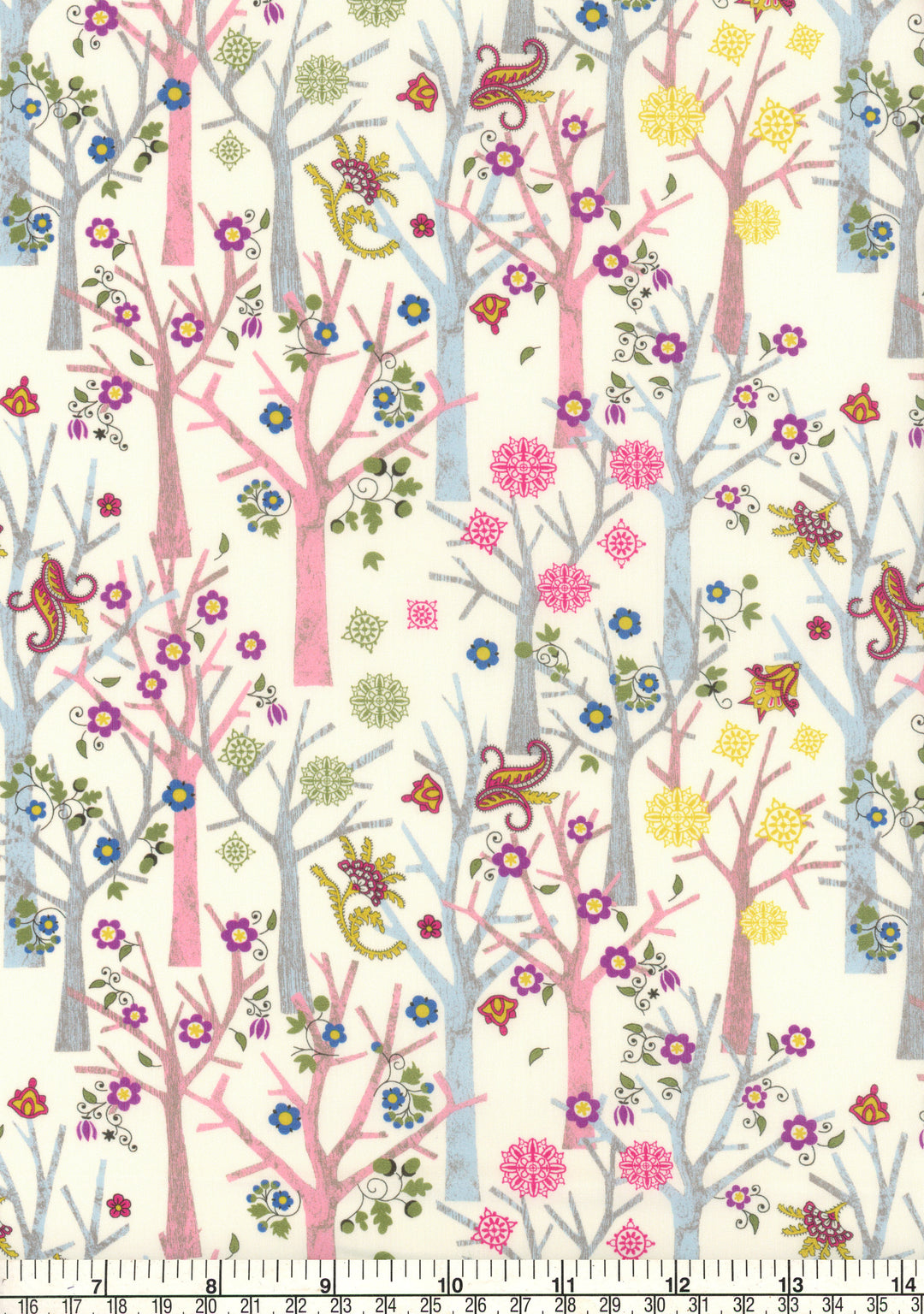 Tuesday Trees is an original design created in 2009 by multi award-winning children’s author and illustrator Lauren Child CBE. Inspired by Lauren’s illustration of the much loved fictional character ‘Clarice Bean’, this joyful print combines fragments of archival Liberty patterns, together with delicately textured trees. A beautifully assembled and collaged Liberty fairy tale forest!