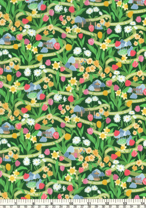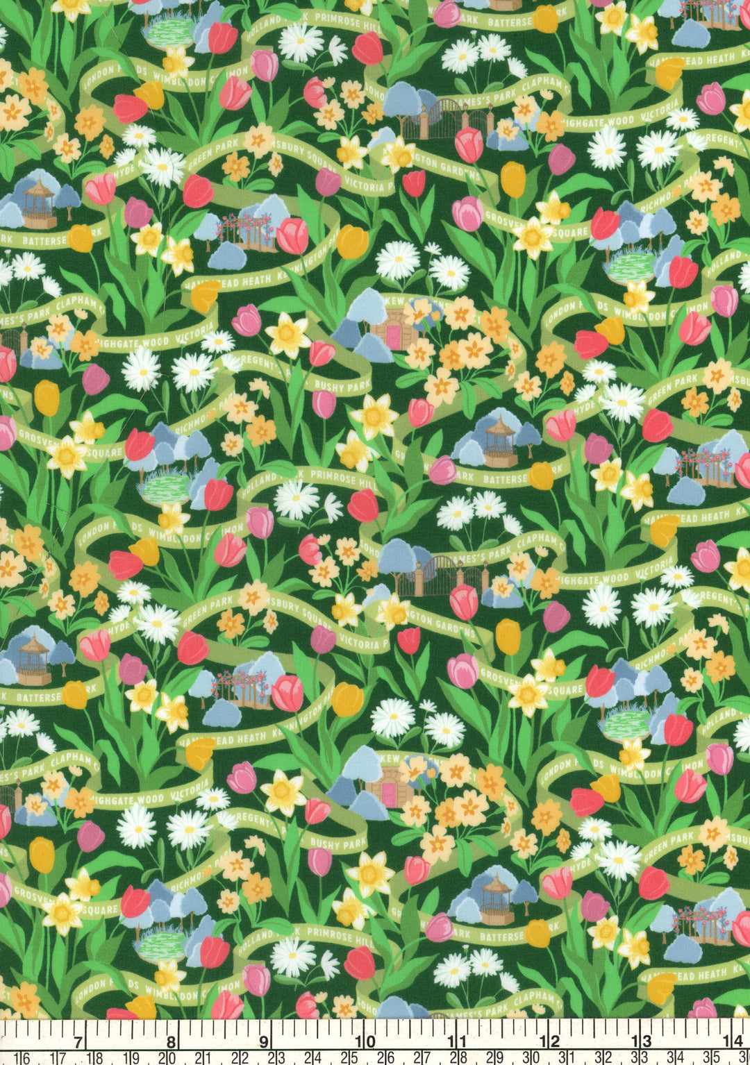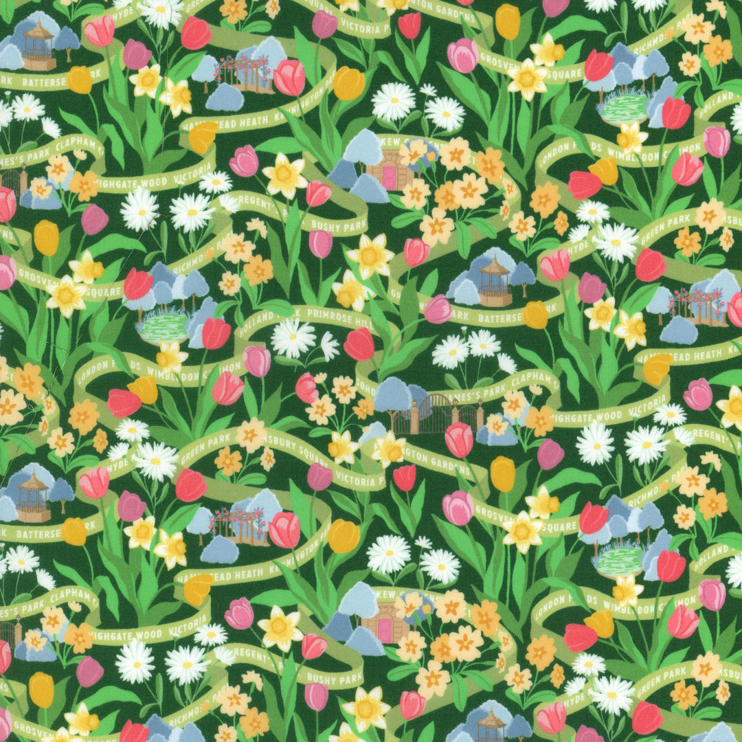 London's parks come alive in spring with colourful tulips, daffodils, primroses, and daisies adorning flowerbeds and parkland throughout the city. This design, meticulously hand-painted in gouache, bursts with vibrant hues. Small scenes are hidden in amongst the flowers, and a path-like ribbon weaves its way through the design, hinting at the names of many of London's greatest green spaces.