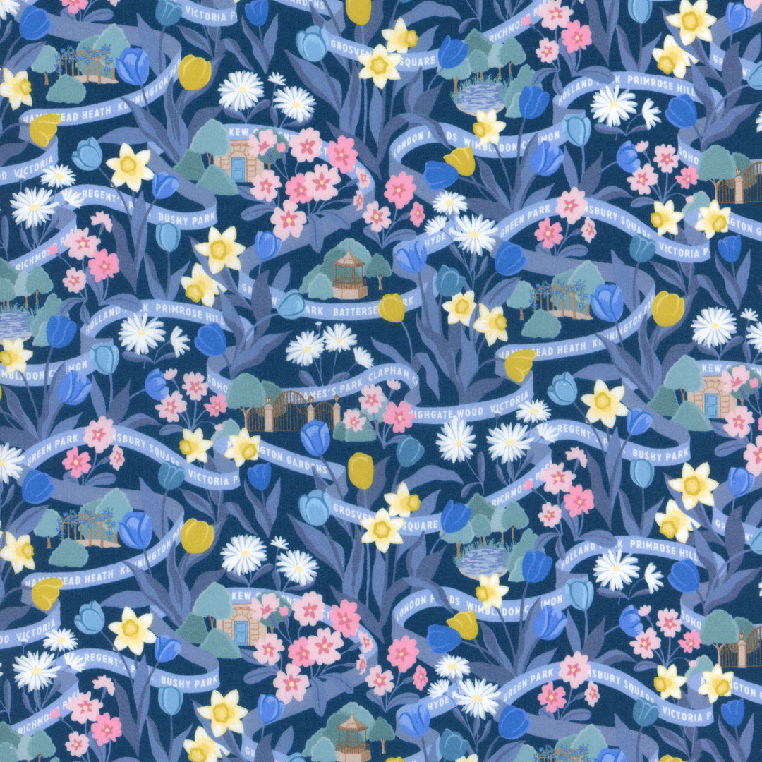 London's parks come alive in spring with colourful tulips, daffodils, primroses, and daisies adorning flowerbeds and parkland throughout the city. This design, meticulously hand-painted in gouache, bursts with vibrant hues. Small scenes are hidden in amongst the flowers, and a path-like ribbon weaves its way through the design, hinting at the names of many of London's greatest green spaces.