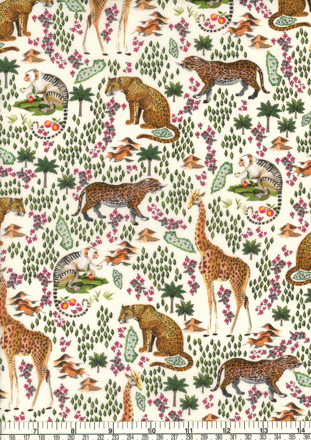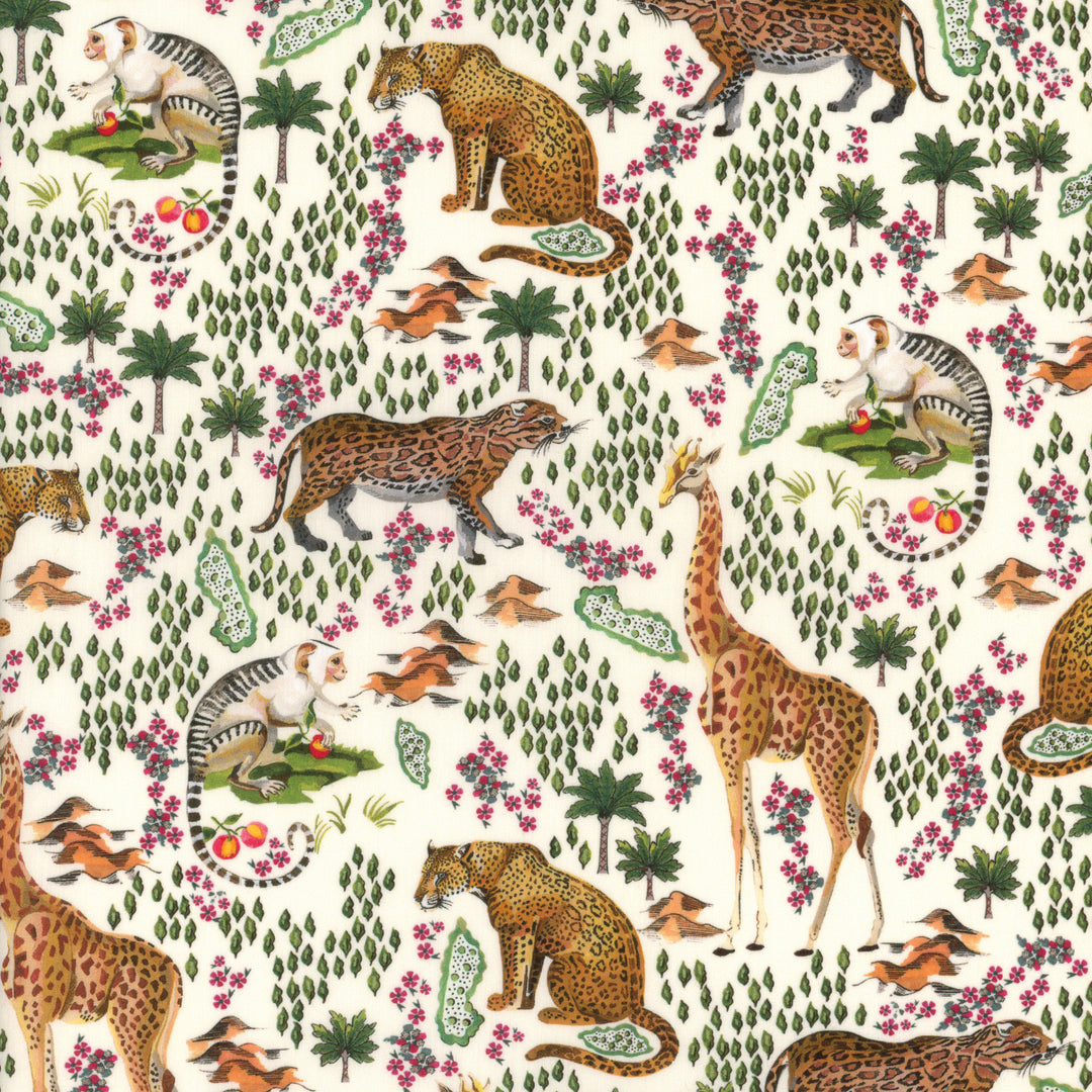 Championing the natural markings found on elegant safari animals, this design is a riot of pattern and colour. Painted in the Liberty Design Studio using gouache paints and fine brushes to add fastidious detail - leopards, giraffes, ocelots and monkeys sit within a landscape of mountains, palm trees and tiny, fragrant blossoms and fruit.
