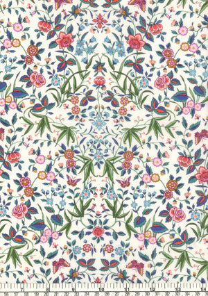 Inspired by an artwork from the Liberty archive, this botanical print features trails of beautifully illustrated flowers, complemented by elegant leaves and colourfully camouflaged butterflies.