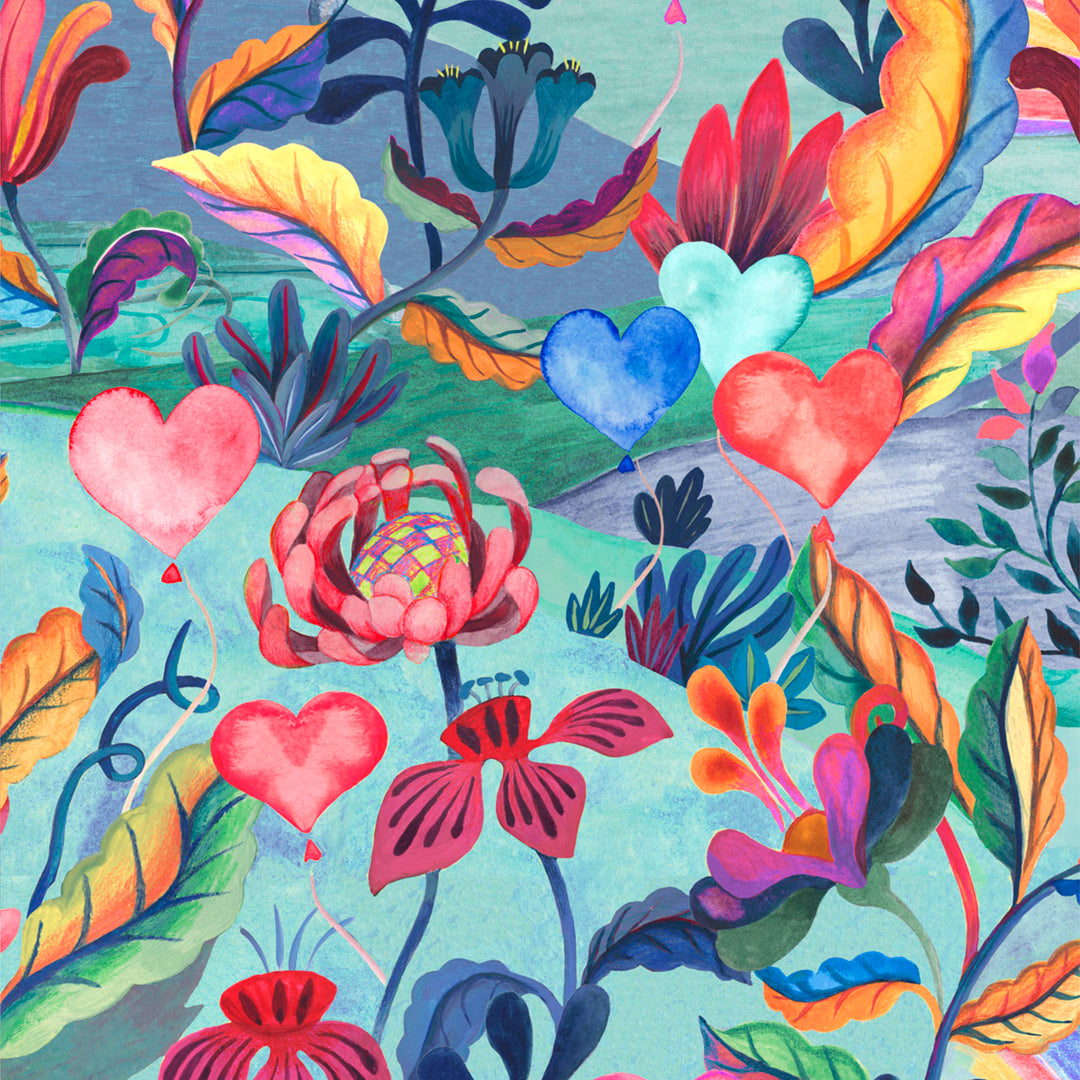 The colour yellow is aligned with positivity and optimism: happiness, sunshine and spring. To reflect this, Una Landscape depicts a picture-perfect world of joy. Painted in watercolour, the design features a meandering landscape where blossoming spring flowers and heart shaped balloons are set against an ever-rising sun.