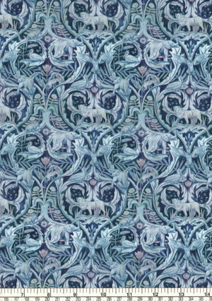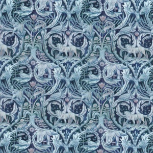 This enchanting design finds its inspiration in the artfully carved wooden animals that have graced the halls of the Liberty Tudor store since 1924. Lions, elephants, monkeys, owls and pelicans coexist within a magical jungle of scrolling foliage and ethereal flowers. Created in the studio with hand-painted inky washes of gouache and coloured pencils, Valerie also references Walter Crane’s vivid Arts & Crafts book illustrations. This print is part of the second chapter of this collection, Collaboration, which reflects the current design team’s celebration of the techniques and styles of their predecessors - bridging the gap between past and present.