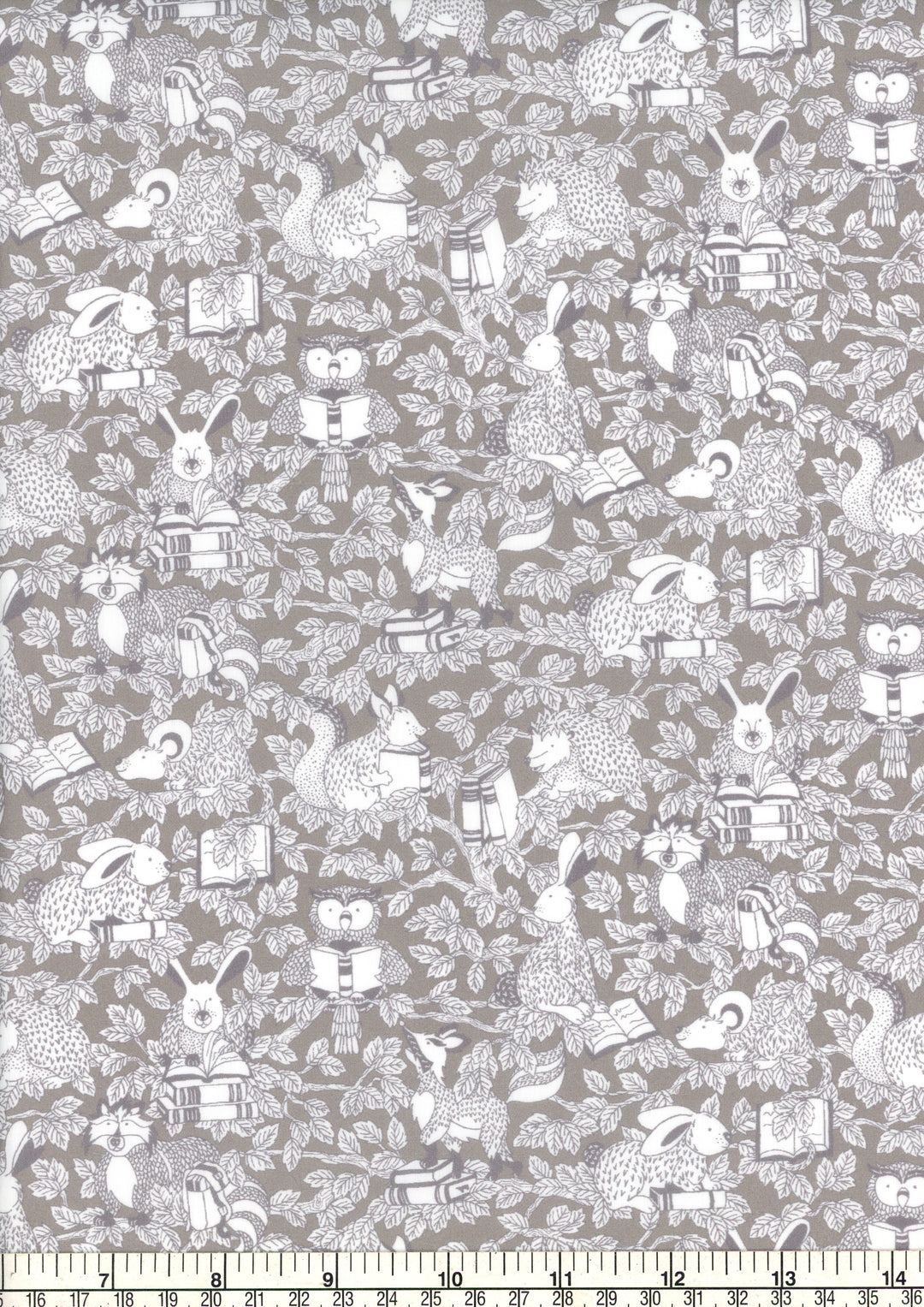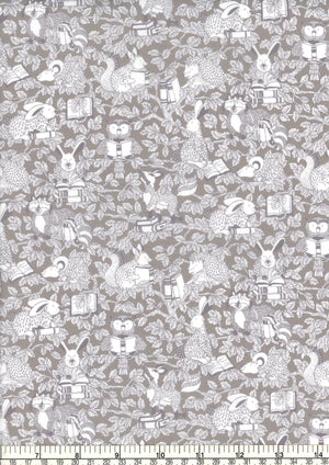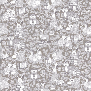 A delightful woodland scene where rabbits, hedgehogs, mice, foxes, squirrels, owls, and raccoons can be spotted relaxing in the branches of the trees, enjoying their favourite books, and reading to their friends. Drawn in fine liner in the Studio, the design has been created using two colours giving it subtlety and inviting the audience to take a closer look to see all the detail.