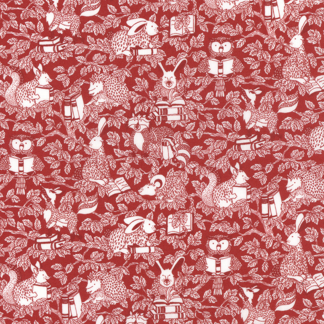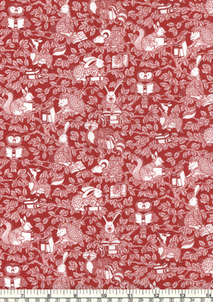 A delightful woodland scene where rabbits, hedgehogs, mice, foxes, squirrels, owls, and raccoons can be spotted relaxing in the branches of the trees, enjoying their favourite books, and reading to their friends. Drawn in fine liner in the Studio, the design has been created using two colours giving it subtlety and inviting the audience to take a closer look to see all the detail.