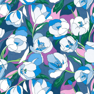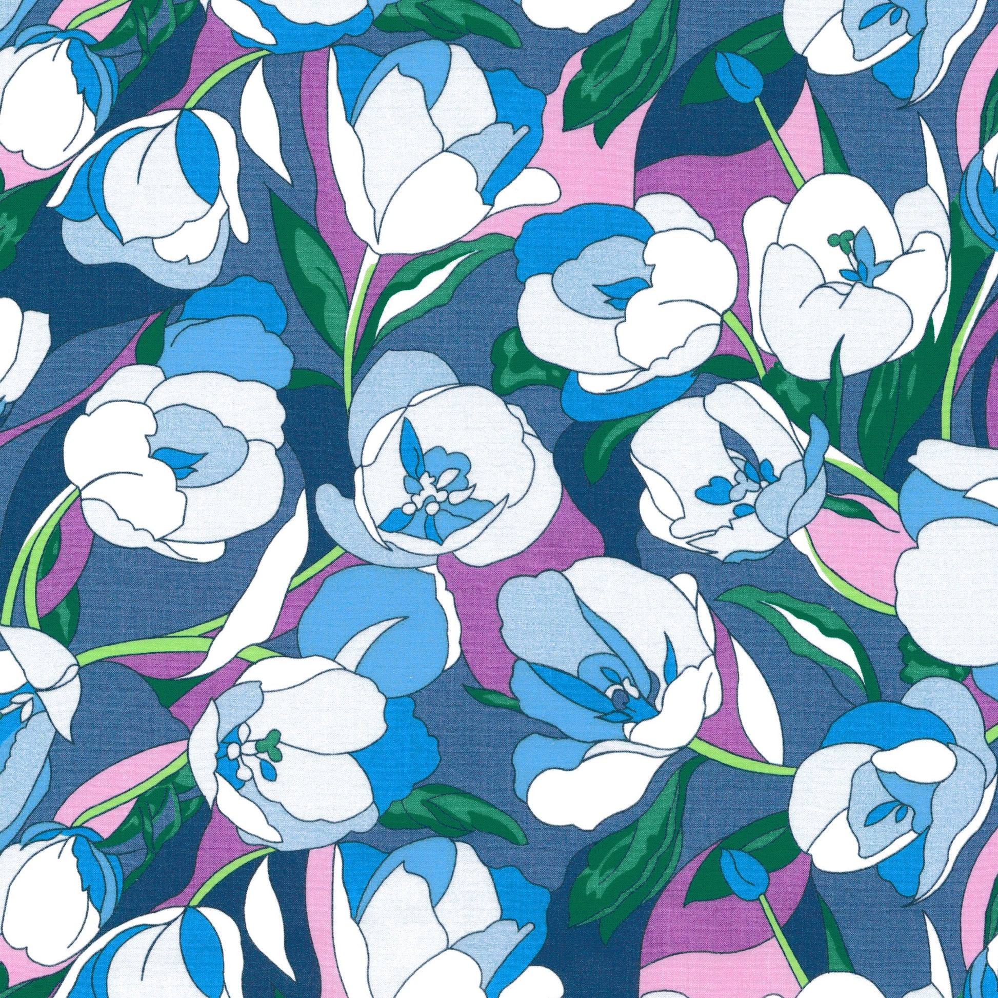 "Adapted from a Liberty pattern originally created in 1960, this stylized floral bounces with energy, saturation, and movement. Floating bundles of outlined tulips exude a sense of contemporary freshness, whilst maintaining a versatile, timeless aesthetic."