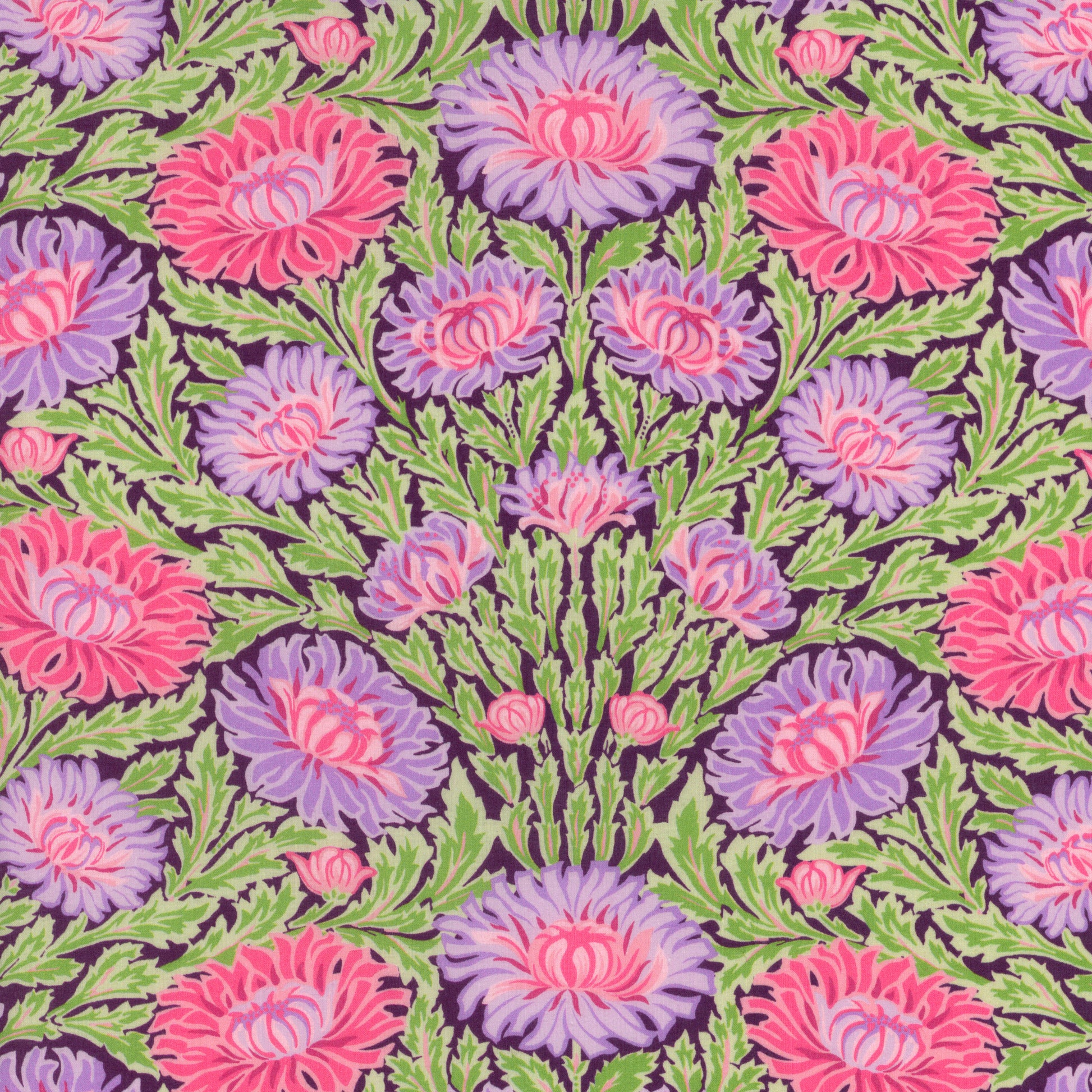 Created in 1991 in the style of an Art Nouveau floral, this luxurious pattern boasts a flourishing flow of synchronised chrysanthemums. Originally printed for Liberty as a furnishing fabric, Cynthia Nouveau has been reimagined into a richly hued botanical, exuding timeless sophistication and elegance.