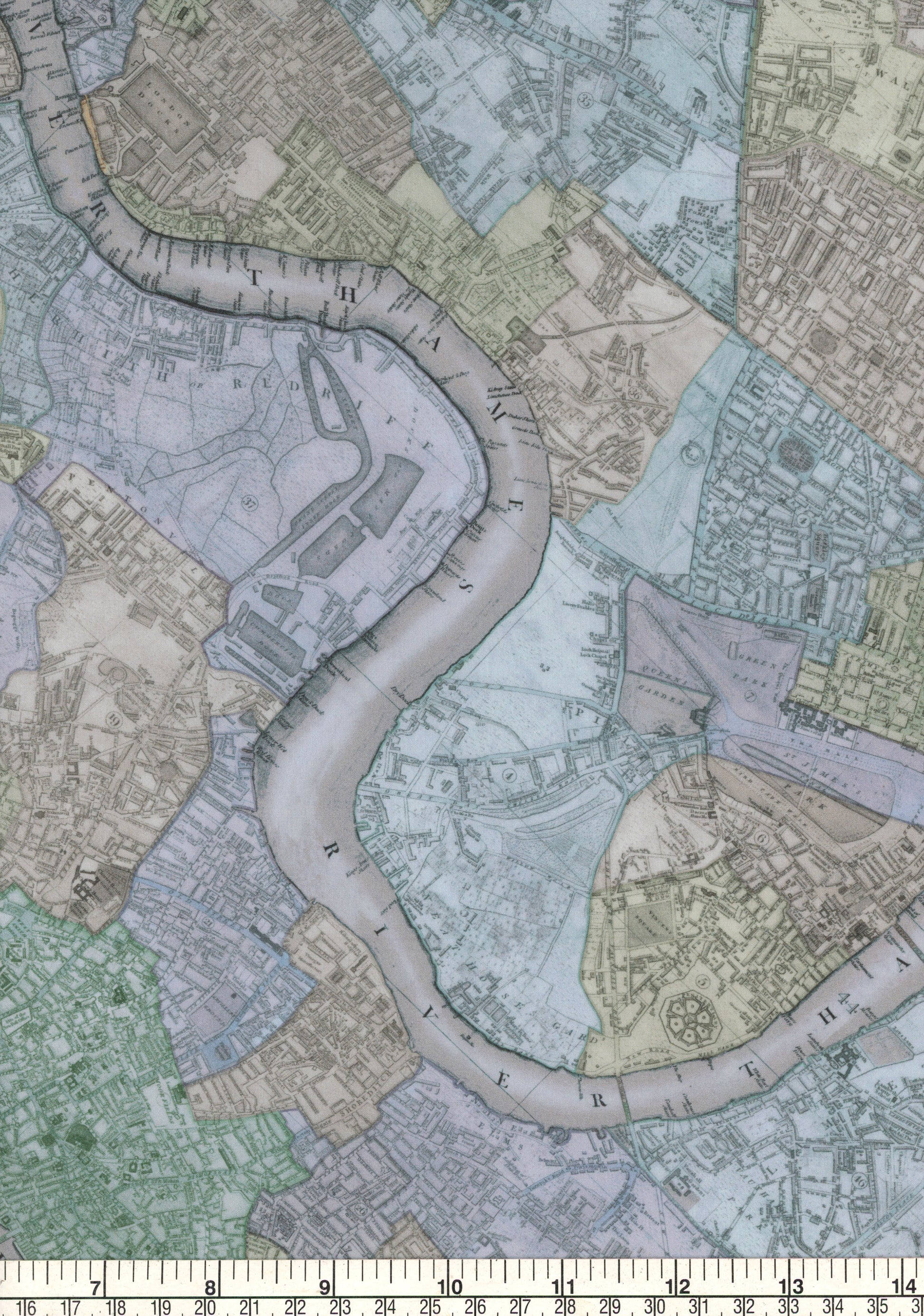 This exquisite map design showcases sections from John Cary's 1822 Plan of London. Highly detailed, it vividly depicts the layout of streets, parks, and the meandering course of the River Thames winding through the city. Each section of the capital is distinguished by varying pastel hues, resulting in a captivating patchwork effect.