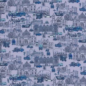 Extraordinary renderings of buildings, machines and even the timber framed Liberty building characterfully populate this London cityscape. The Liberty Design Team extracted and rearranged motifs from their original square formation to make a wearable conversational design spotlighting an array of colourful city sights, from roadworks to lampposts and iconic red buses.