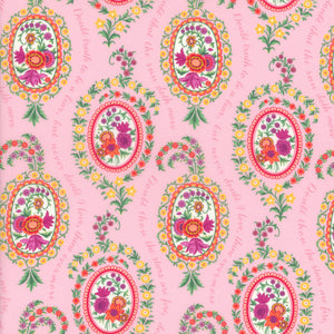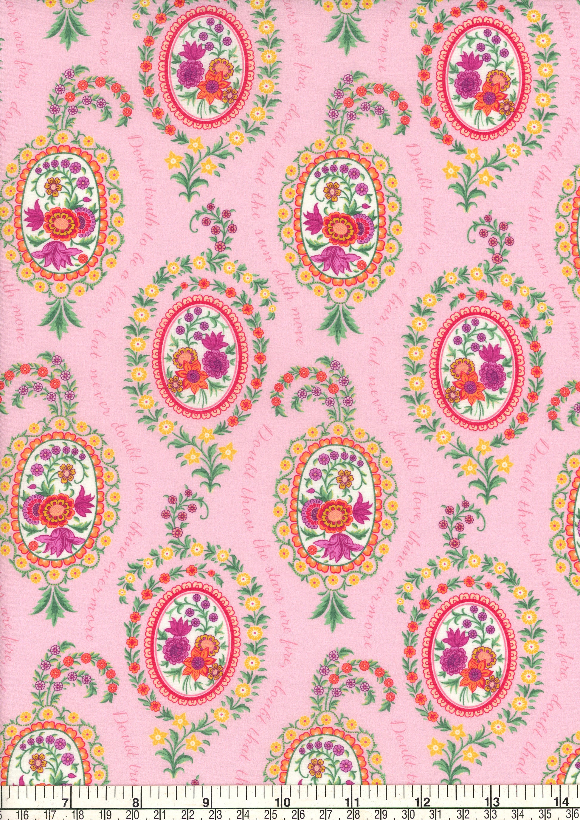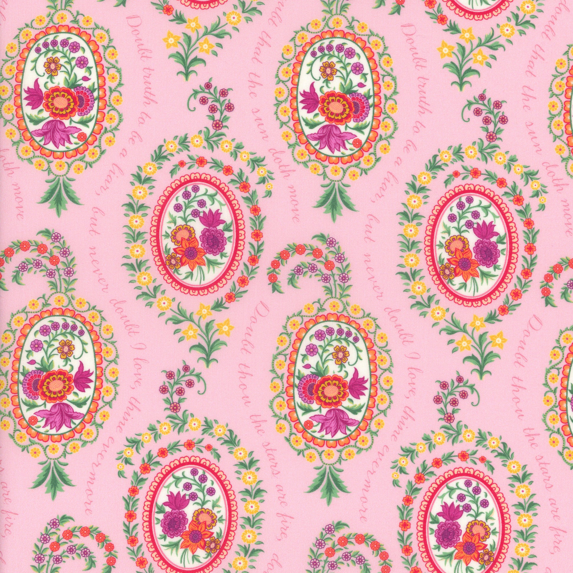 Love Poem draws inspiration from a miniature hand-pained artwork found within the pages of an archival pattern book dating back to the 1820s. Arranged in and around oval shaped botanical vignettes, its delicate blooms feature Persian-style flowers including tulips, chrysanthemums, and carnations. Take a closer look to discern the subtle words of a romantic love poem, gracefully woven amidst the elegant motifs.