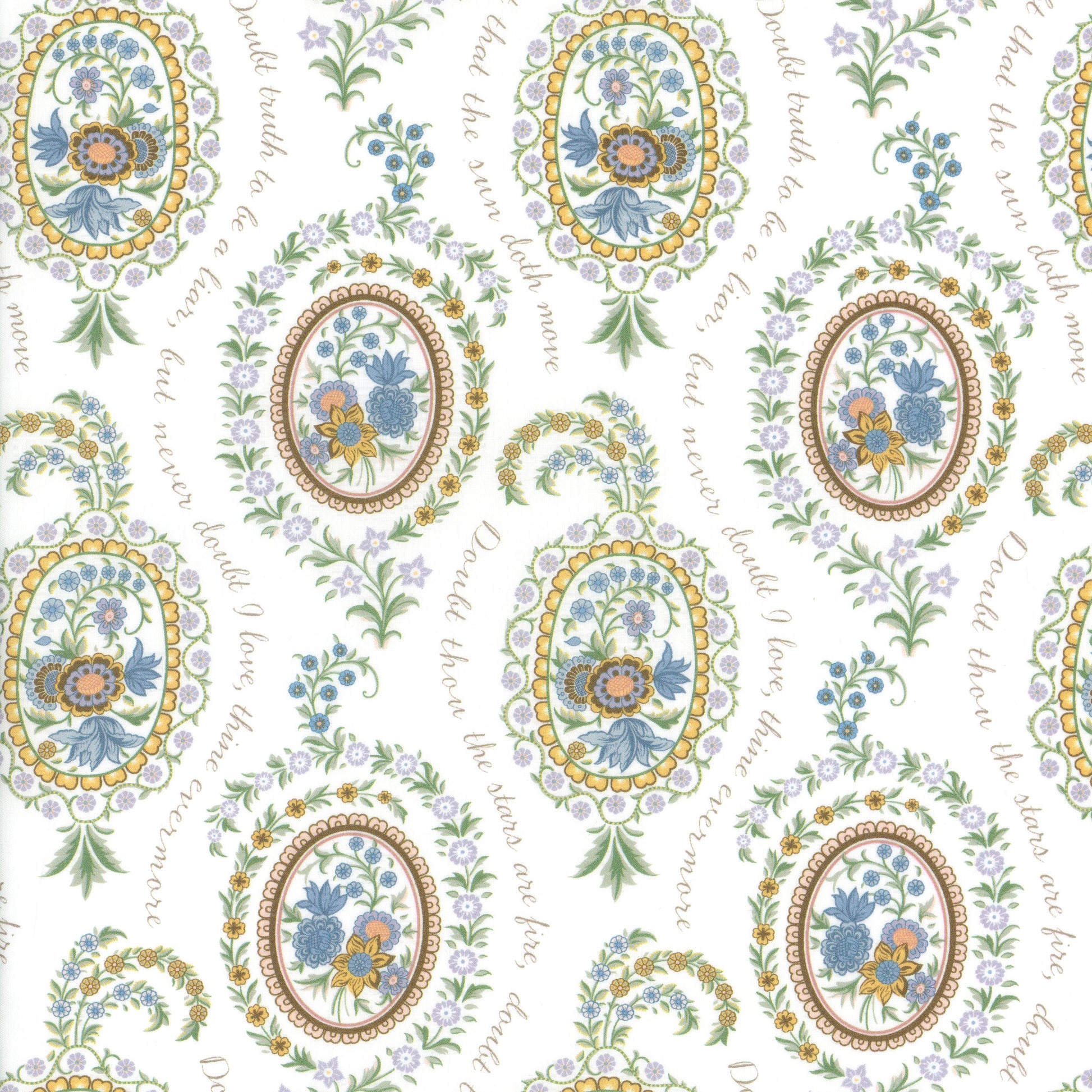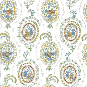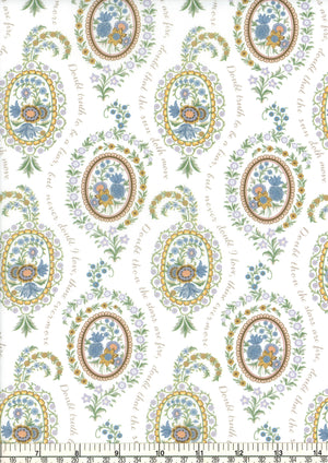Love Poem draws inspiration from a miniature hand-pained artwork found within the pages of an archival pattern book dating back to the 1820s. Arranged in and around oval shaped botanical vignettes, its delicate blooms feature Persian-style flowers including tulips, chrysanthemums, and carnations. Take a closer look to discern the subtle words of a romantic love poem, gracefully woven amidst the elegant motifs.