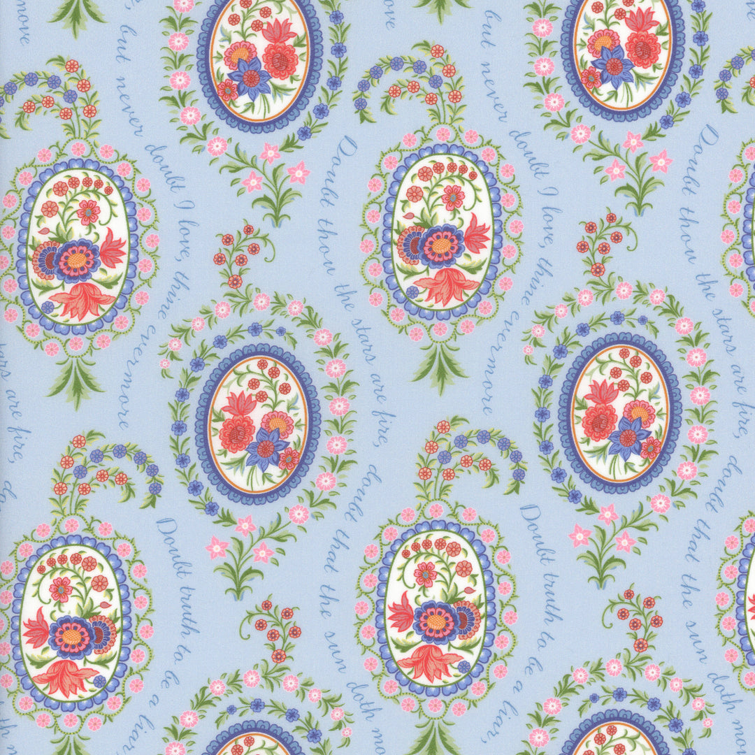 Love Poem draws inspiration from a miniature hand-pained artwork found within the pages of an archival pattern book dating back to the 1820s. Arranged in and around oval shaped botanical vignettes, its delicate blooms feature Persian-style flowers including tulips, chrysanthemums, and carnations. Take a closer look to discern the subtle words of a romantic love poem, gracefully woven amidst the elegant motifs.