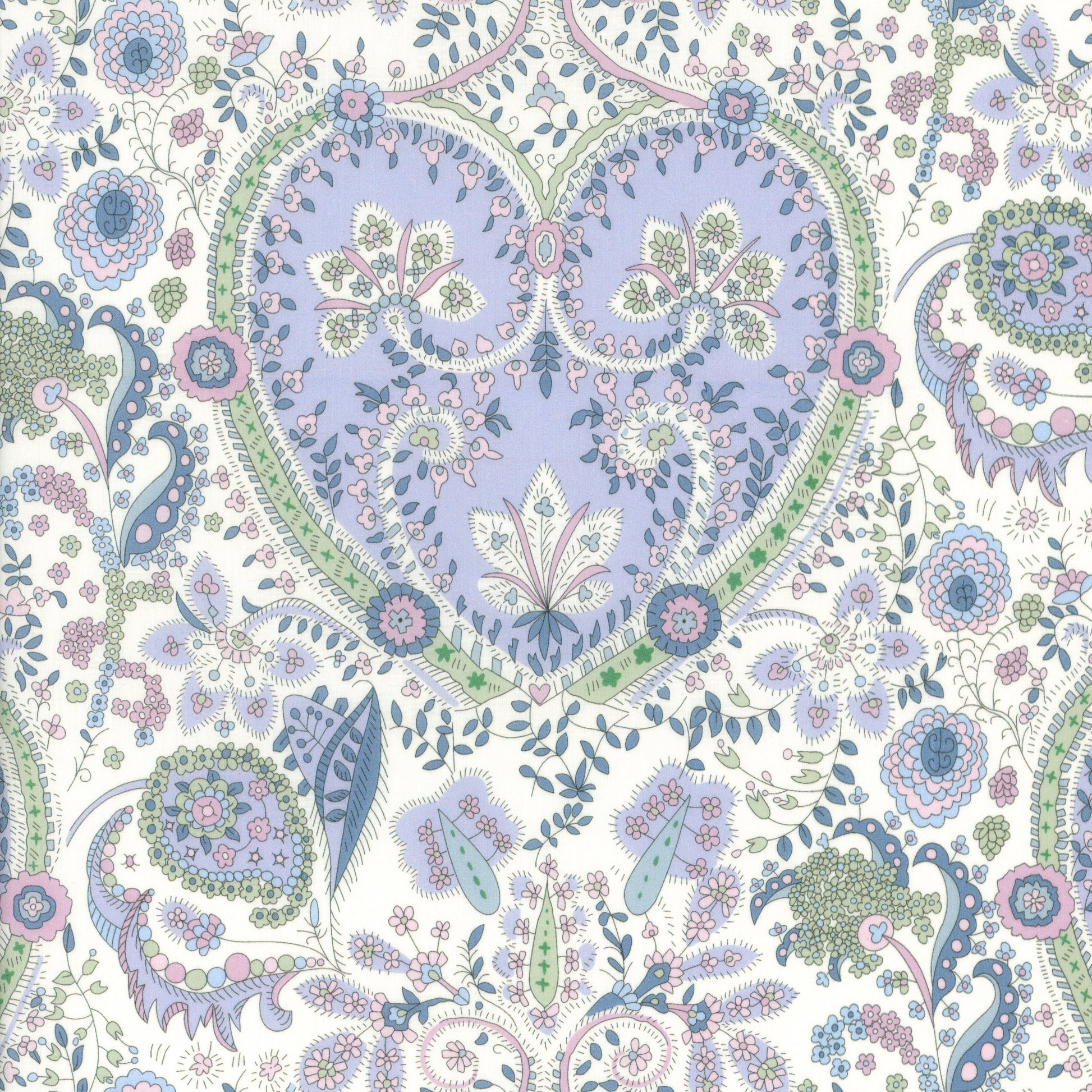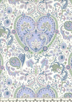 Theri Kitty showcases an intricate paisley design, adorned with beautifully embellished heart-shaped motifs and surrounded by drifting tendrils and delicately stylized flowers. Inspired by a 19th-century artwork from the Liberty archive, this charming print was meticulously redrawn and recolored in soft yet refreshing color palettes.