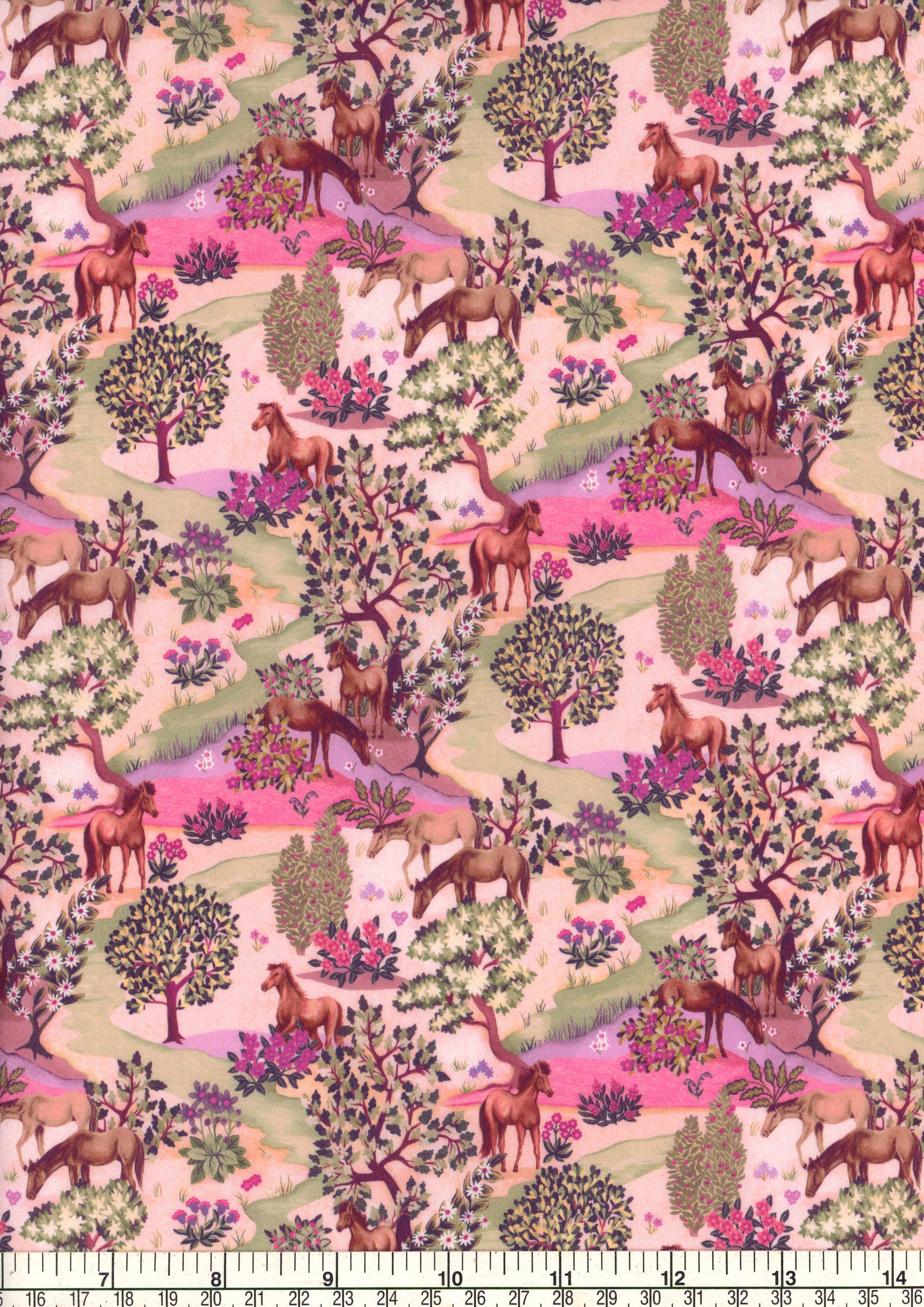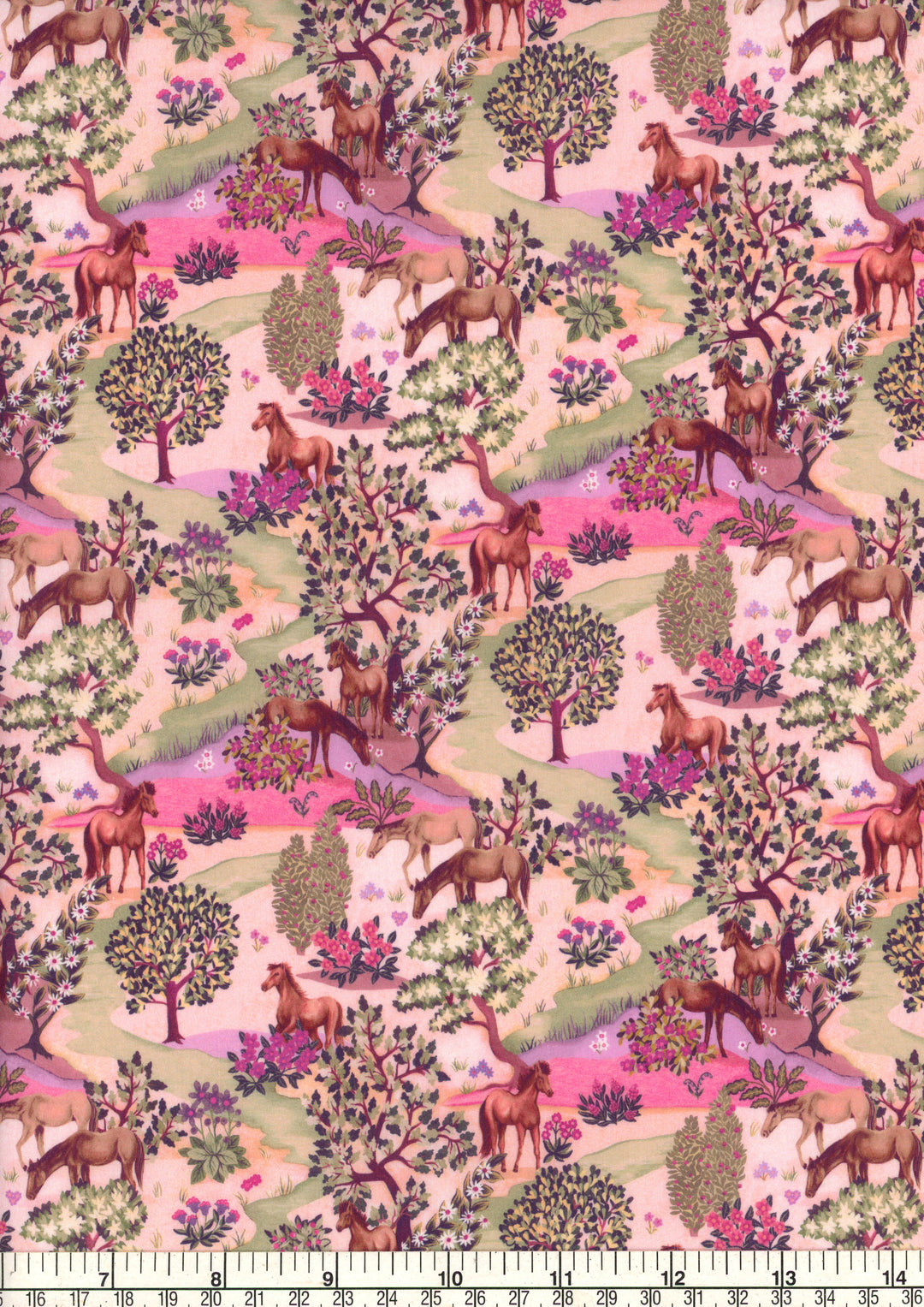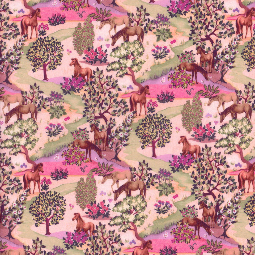 Hand-painted in the Liberty design studio using gouache paints and watercolor, Grasslands depicts horses grazing, camouflaged in a beautiful flower filled landscape. Inspired by Arts and Crafts landscapes, the trees and plants within the design have an archival feel.