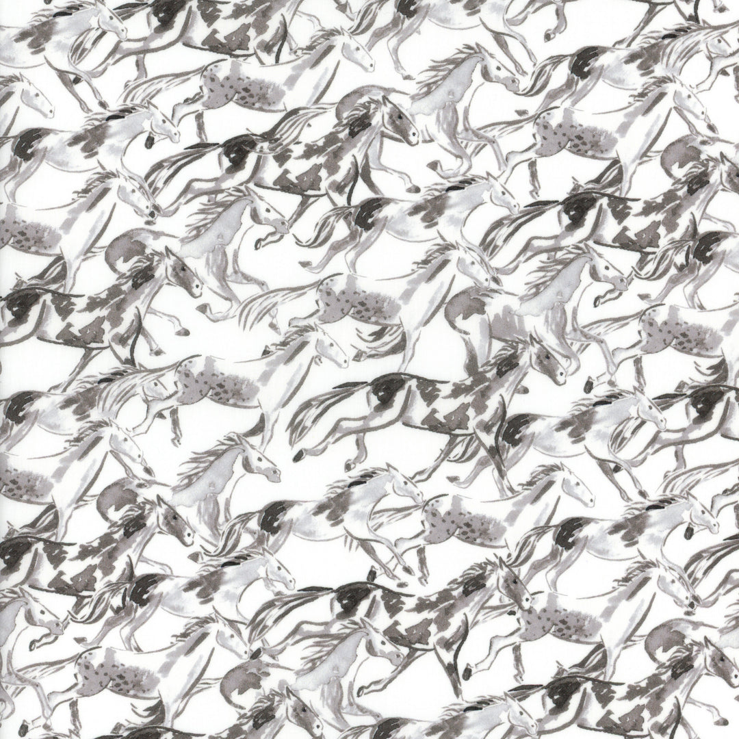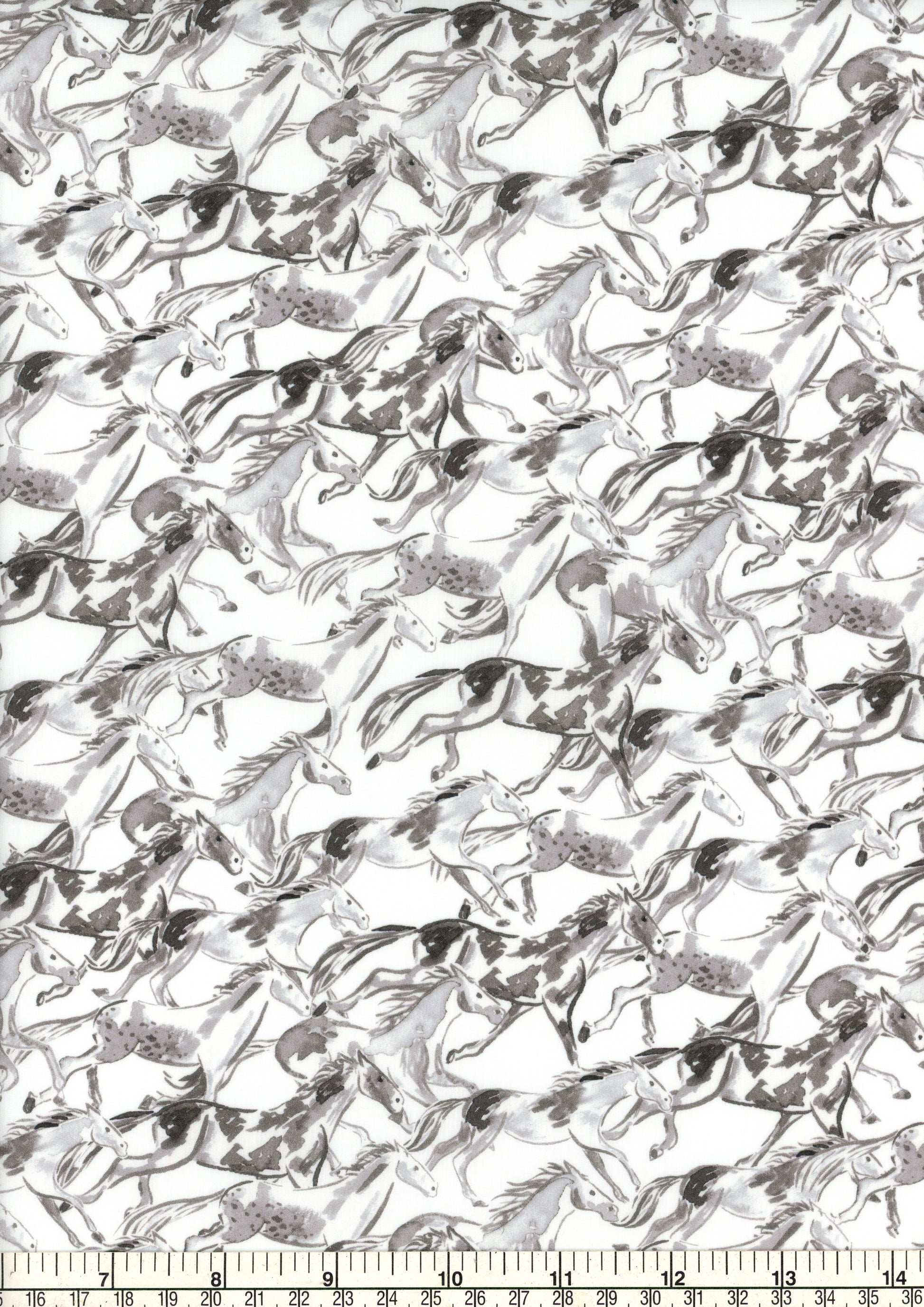 This design is created from beautiful ink paintings of horses. The wild horses are shown galloping across the fabric, with manes and tails flowing. The soft washes of Indian ink have been used to create a variety of dappled patterns on the horses' coats.